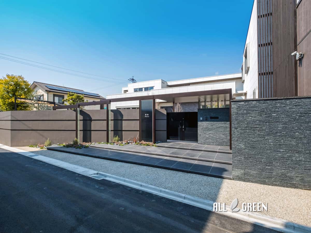天然石とクラッシュガラスと屋根付きゲートで魅せる清須市のハイクローズ新築外構