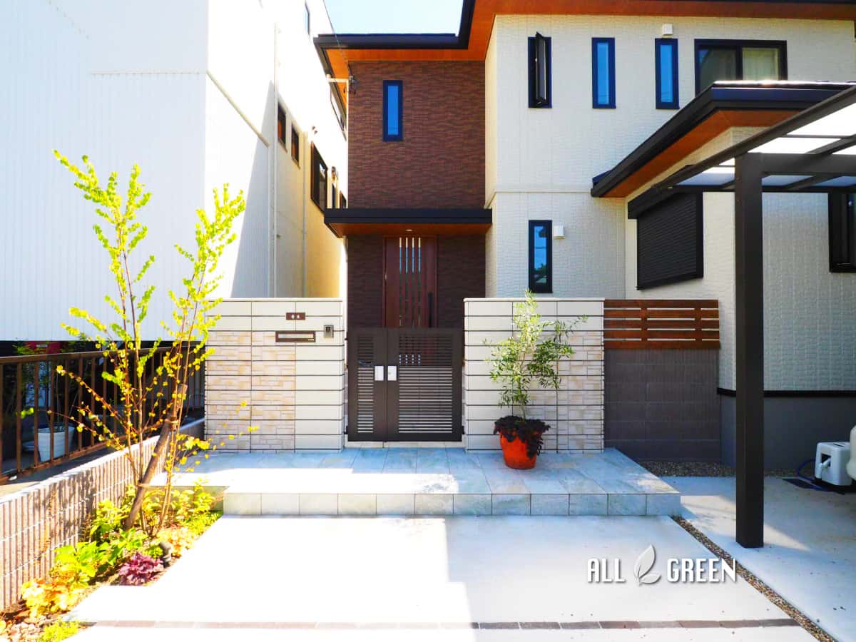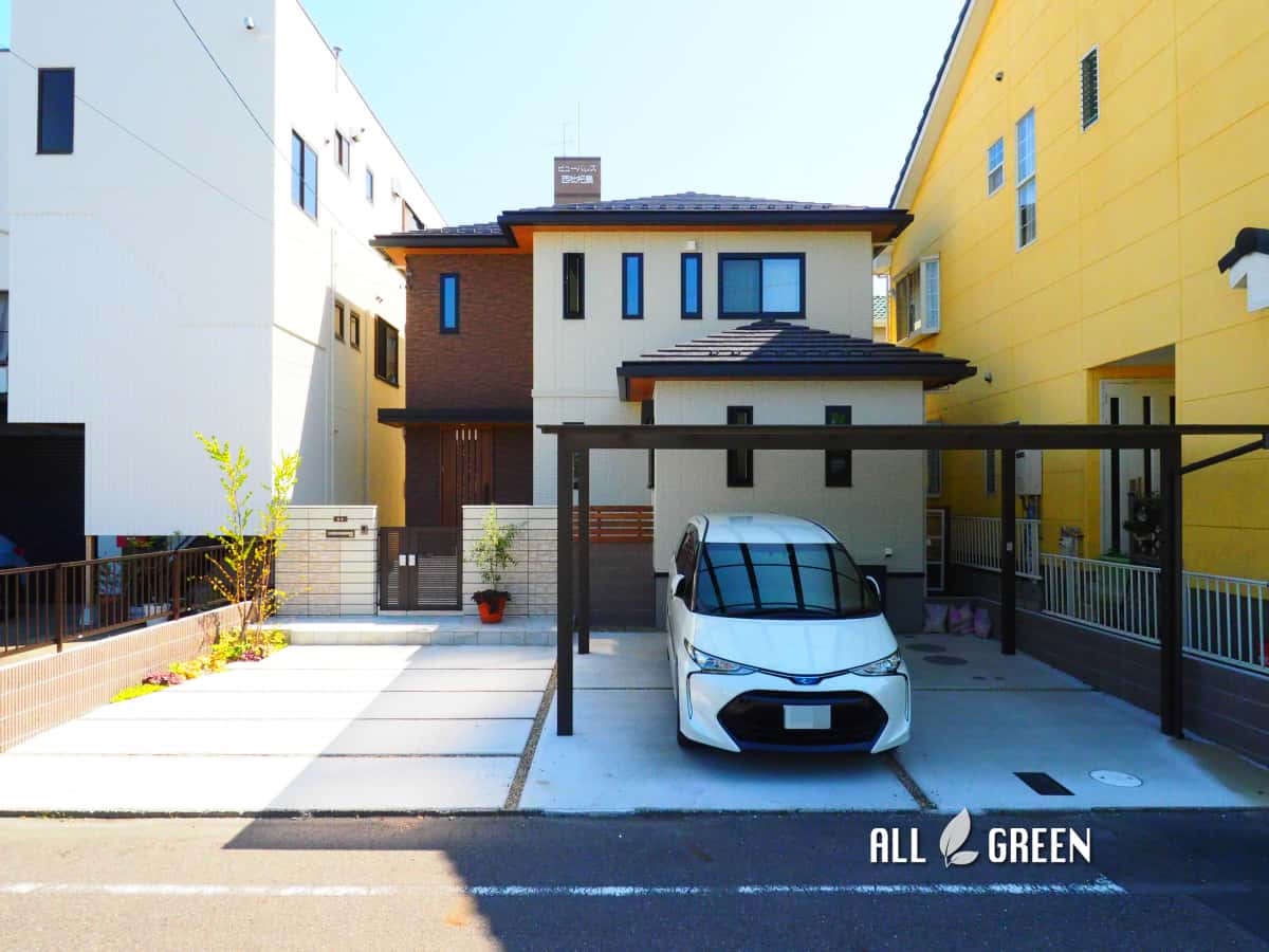 | 使用商品 | 門塀:UNISON ウエルズウォール ドリスウォール 床タイル:LIXIL ジョイアストーン LIXIL サンベネゼ 門扉:LIXILライシス1型04+08−12 カーポート:LIXILネスカFワイド 54−54ロング柱 |