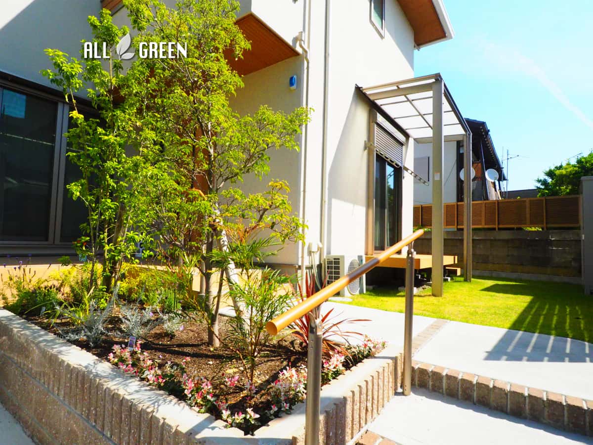 アプローチにある植栽スペースは階段上にも続いているような形ですが、背の低い植物を植えているので圧迫感がありません。