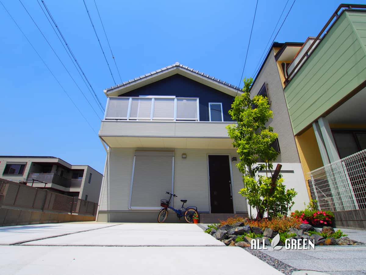 道路との境界塀も門壁と同じ白で塗装したため、外から見ても青い外壁に映える爽やかで統一感のある外構となりました。