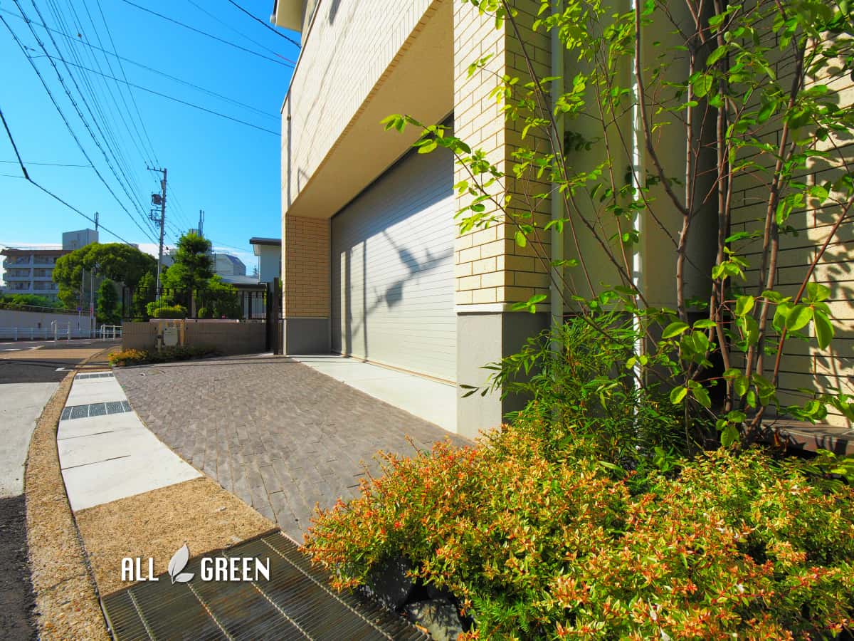 車が行き来する場所と人が通るアプローチを植栽で区切ってあります。