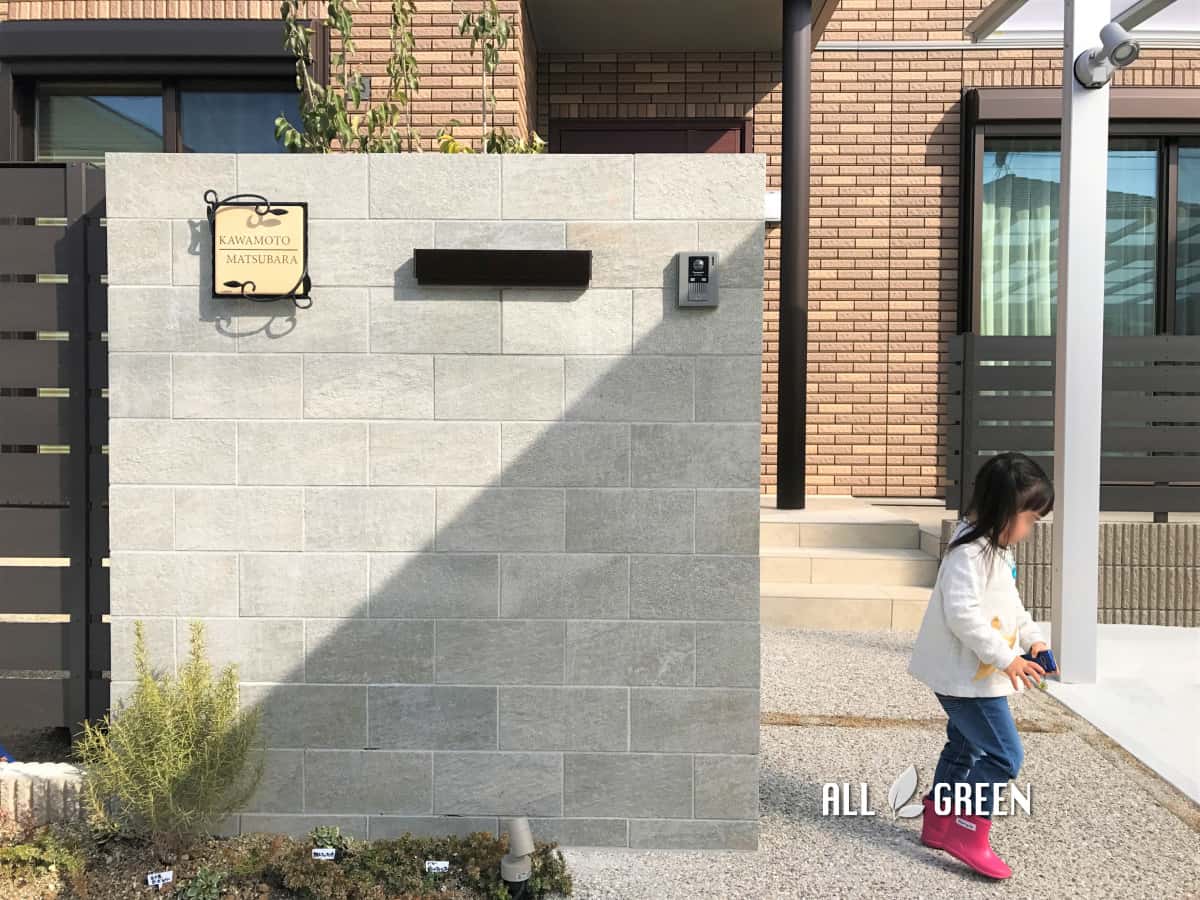 門塀にはOnlyoneのラビエ315。天然石の表情を忠実に再現したもので表面の触り心地は天然石さながら。