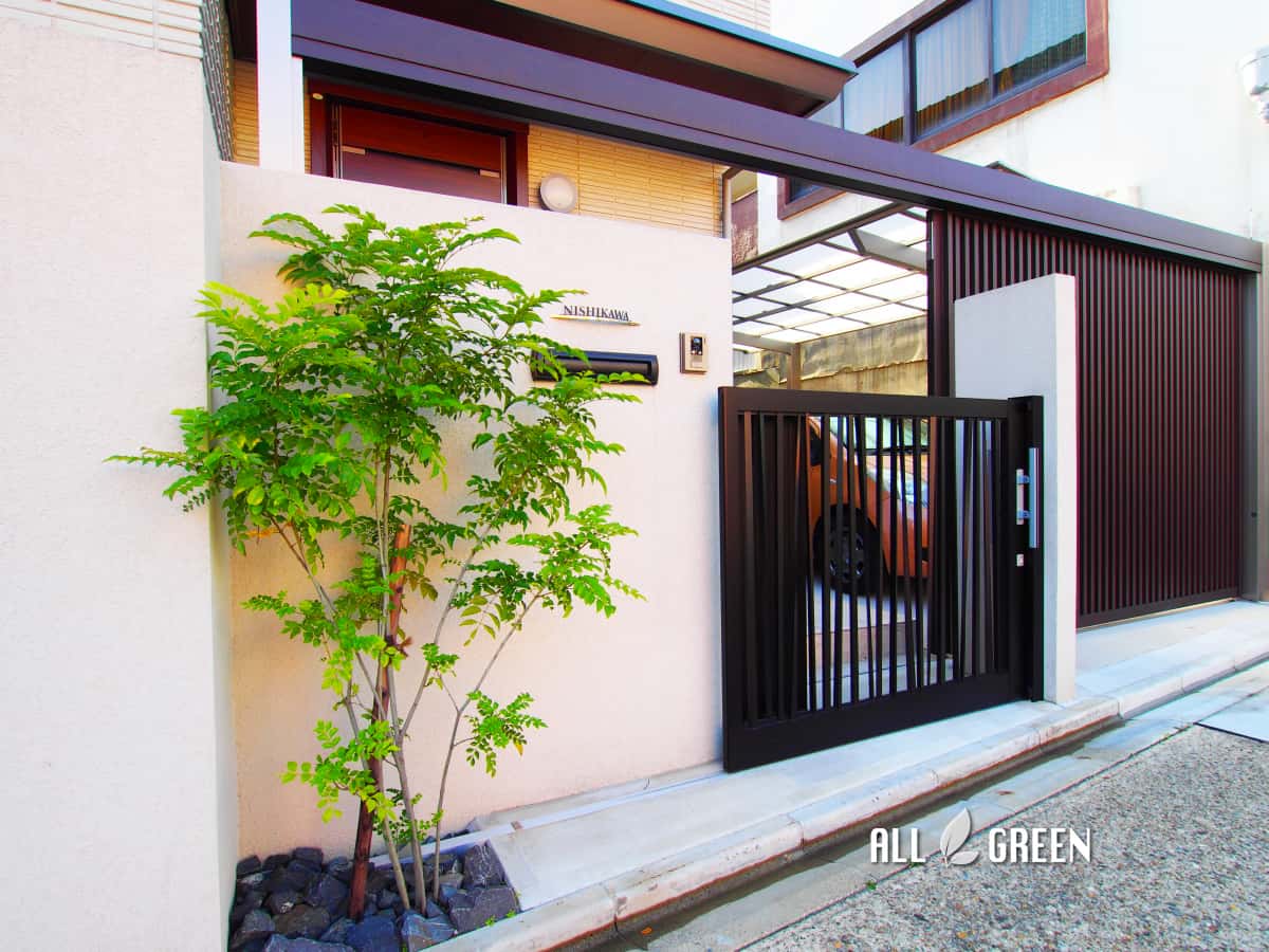 門塀近くの植栽スペースは地面をグレーの石で覆い、土を露出させないことで生き物である樹木を際立たせています。