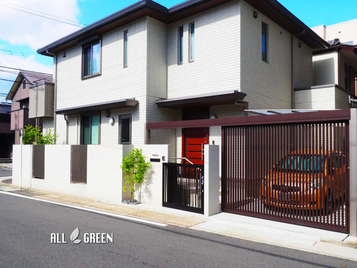 プラスGの木調色と門まわりのブラック、そして植栽の緑が、白系統の邸宅と塀に対してバランスが良くいいアクセントとなりました。