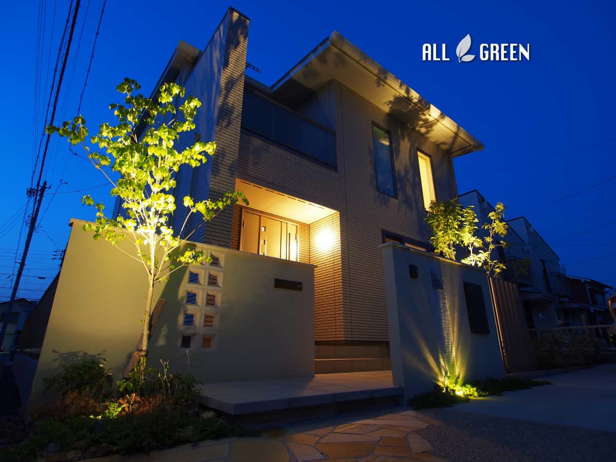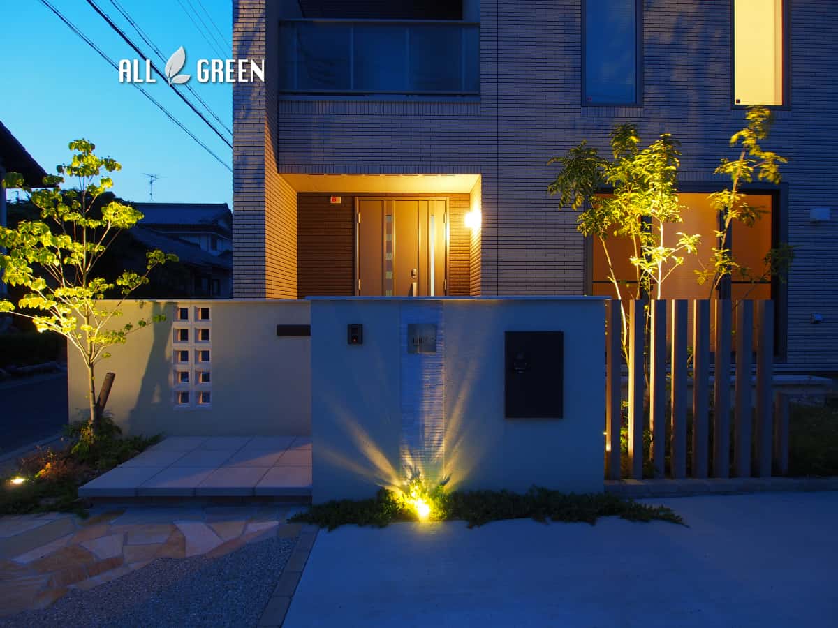 細かいところまで可愛らしさのある外構デザインですが、夜になるとライティング効果でまた違った表情を見せてくれる素敵なデザインとなりました。