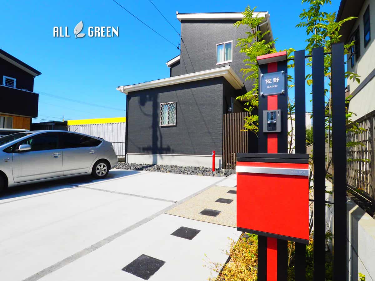 特にポストと立水栓は外壁や機能門柱の柱部分の暗色とも合う赤のアクセントカラー入れることによってシンプルだけどインパクトのあるものを演出できたかと思います。