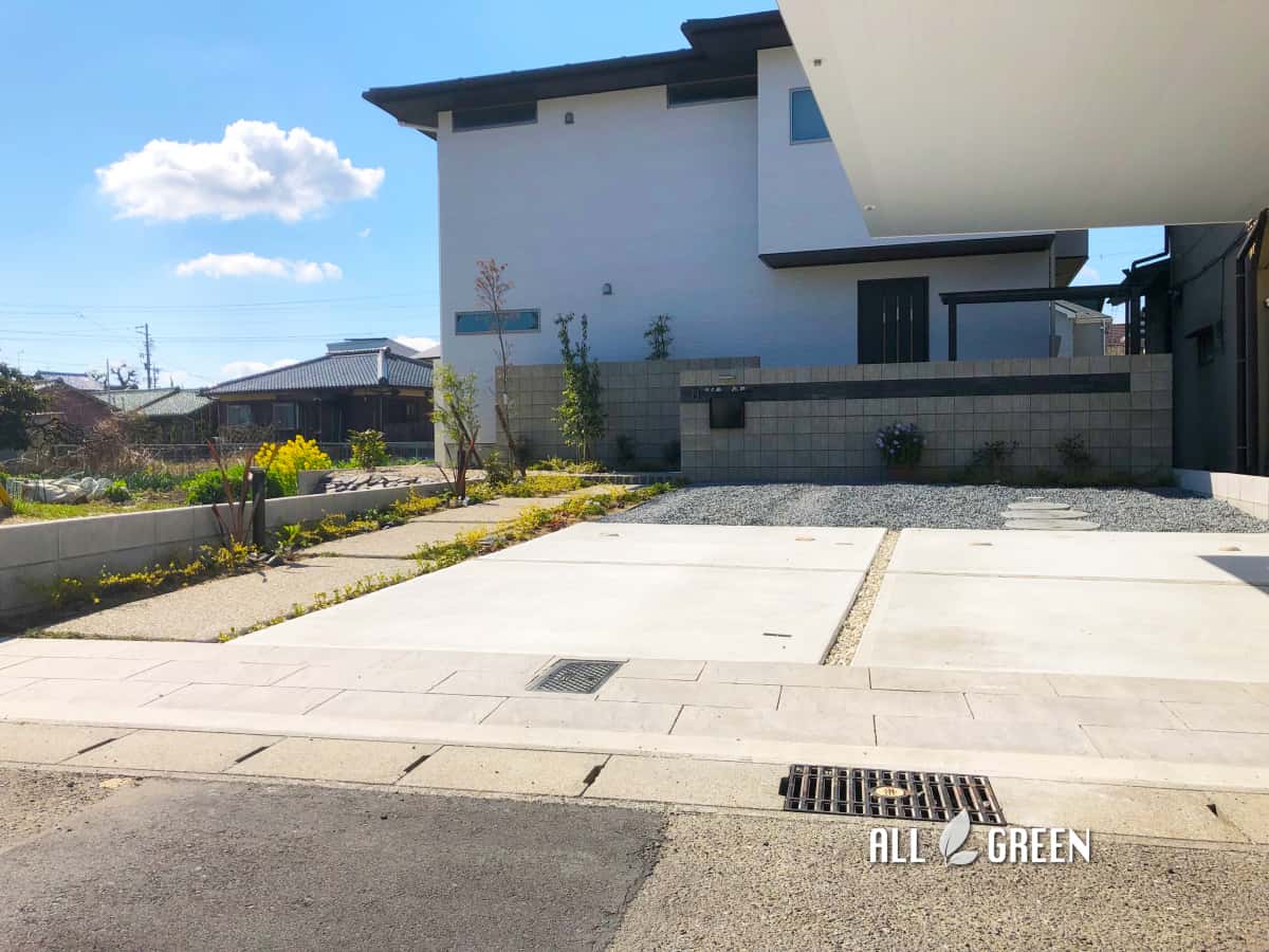 | 工事内容 | 大治町 O様邸 新築外構工事 ブロック積工事・土間コンクリート工事・アプローチ工事・立水栓工事・ウッドデッキ工事・階段工事・植栽工事  |
