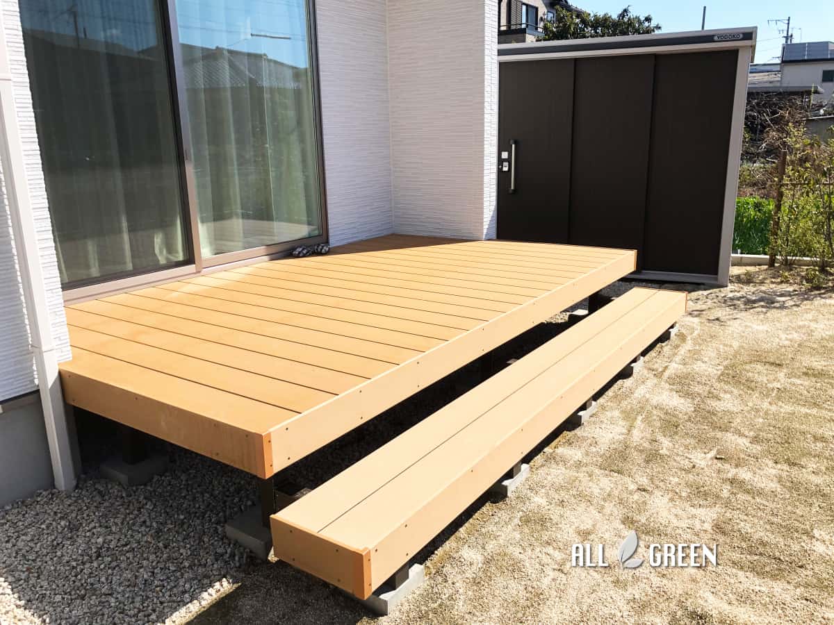 メンテナンスが要らないというのも樹ら楽ステージは天然木デッキとは違い、腐食・シロアリに強い、木の色が長持ち、汚れても水洗いですぐ洗い流せるなど利点がたくさんの人工木デッキだからです。2間×7尺のサイズで作った樹ら楽はしっかりとくつろげるスペースを確保しつつお庭全体が狭くならぬよう考慮したサイズ感となっております。