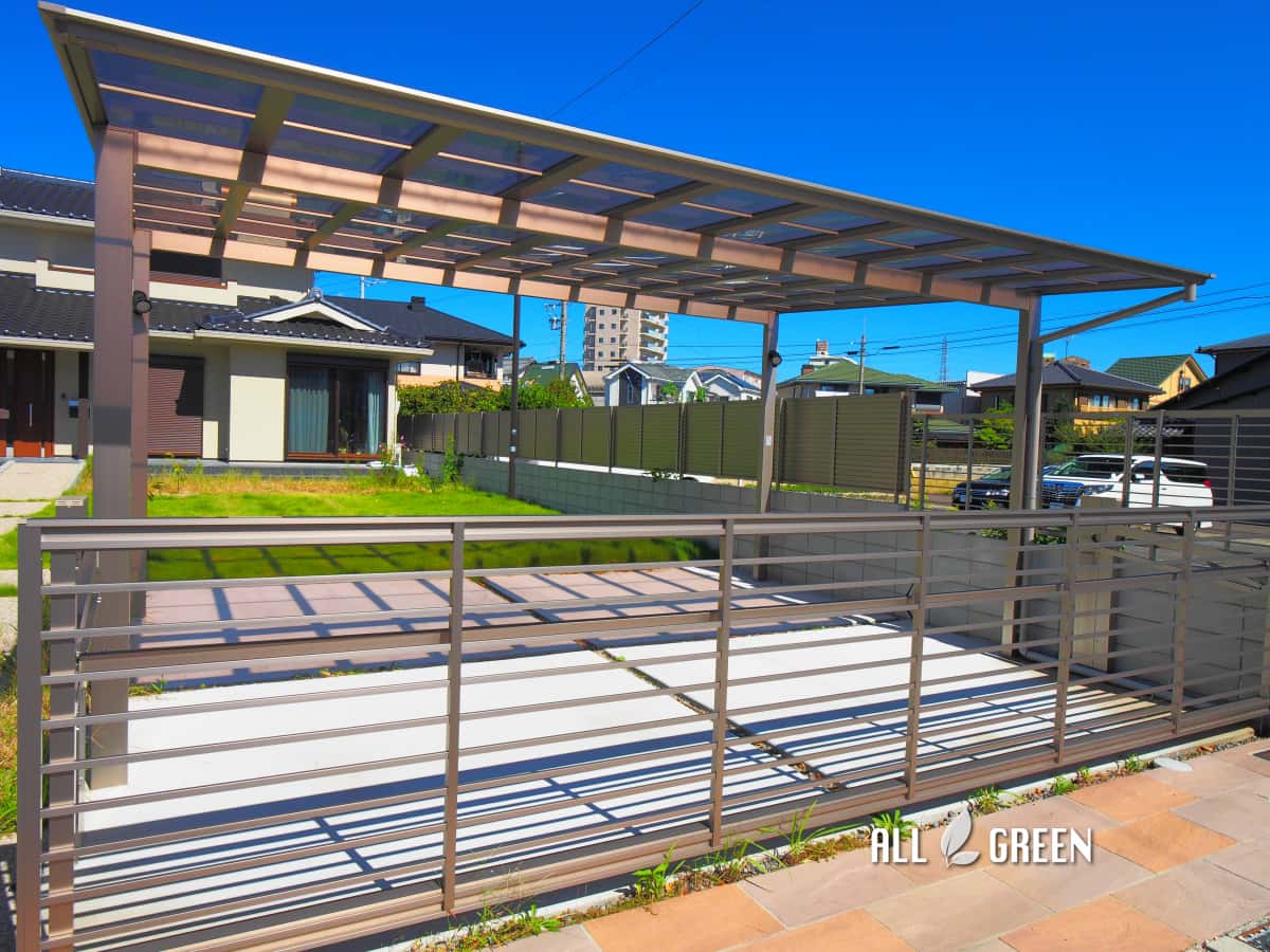 一方で車庫まわりは直線的かつアルミ色の製品を使うことで、かっちりとメリハリの利いた外構となりました。