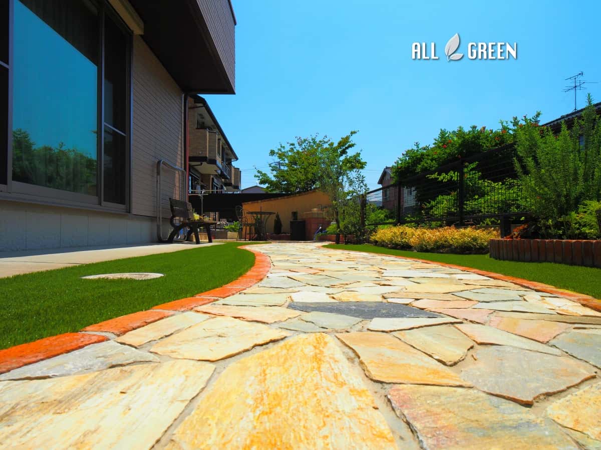 | 商品 | 人工芝:エクアライブ ZEROターフ+防草シート 乱形石貼り舗装:UNISON クレモナストーン(ゴールデンイエロー) 見切り:UNISON ソイルレンガ210(アンチックオレンジ) 花壇(小端立て):UNISON ソイルレンガ210(アンチックオレンジ) |