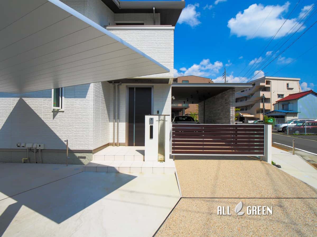 | 外構工事概要 | 名古屋市中川区O様邸新築外構工事 駐車場、カーポート、オーバードア、アプローチ、門塀、ライティング |