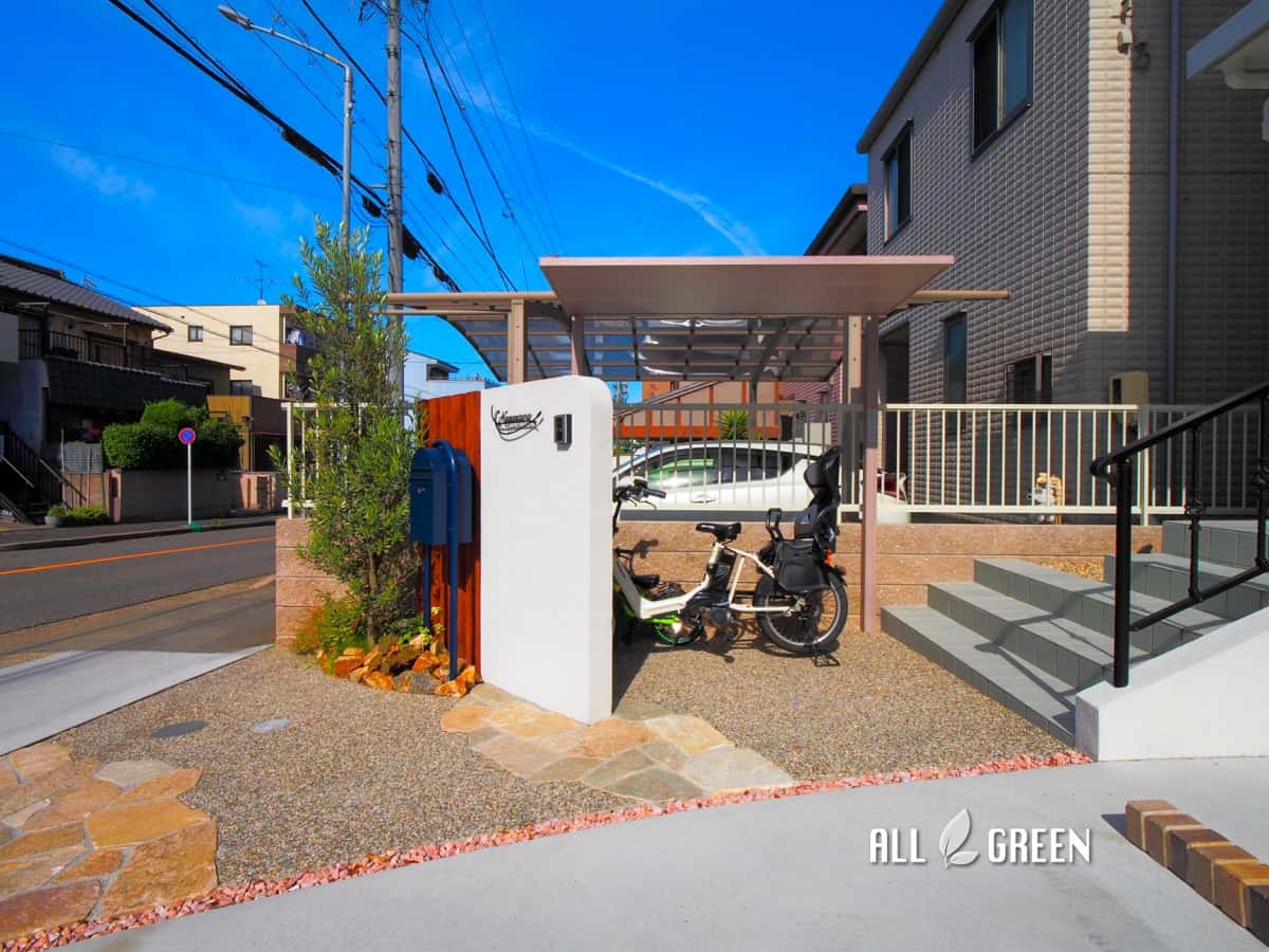 サイクルポートは門塀裏に設置。正面から見た際 駐輪した自転車が門塀に隠れ、見えなくなるよう設計しています。