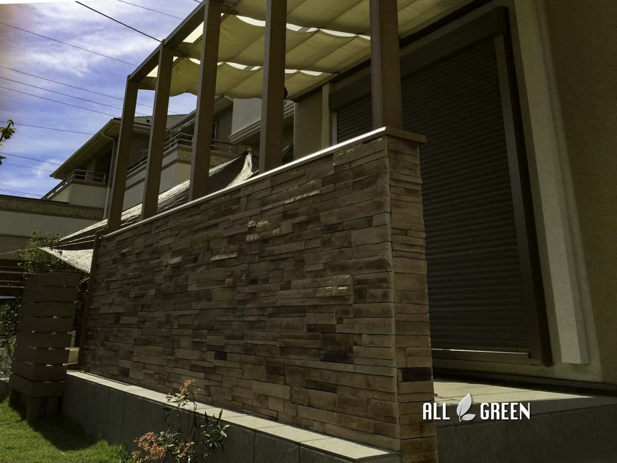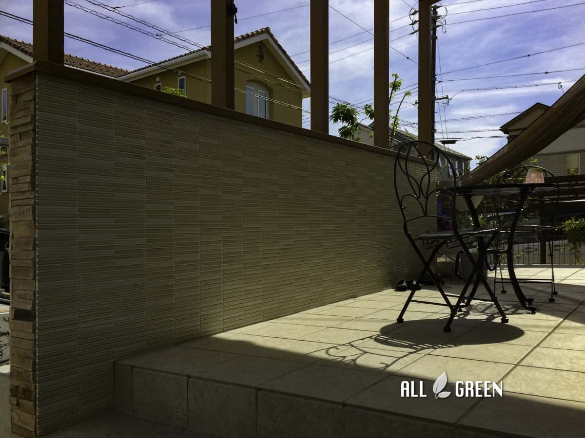 腰壁のオープンテラスタイプを設置したので、風通りも良く、腰壁で足元を隠したセミオープンな空間が出来上がりました。