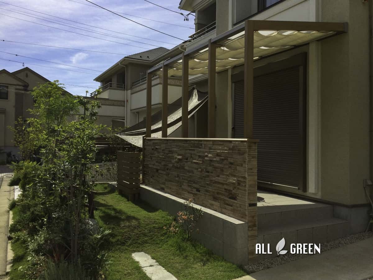 | エクステリア商品 | タイルテラス:INAX マルモアート(IPF−300/MA−14) LIXIL cocomaII オープンテラス腰壁タイプ (クリエラスク+シャイングレー) 外・側面:Onlyone プロフィットレッジストーン(サウスウエストブレンド) 内面:Onlyone エリアボーダー彩(LB−802:LB−9742=8:2) 内部日除け(グレー) 屋根材(クリアマット) 立水栓:UNISON ウンディーヌ フェンス:タカショー エバーウッド(ナチュラルパイン) |