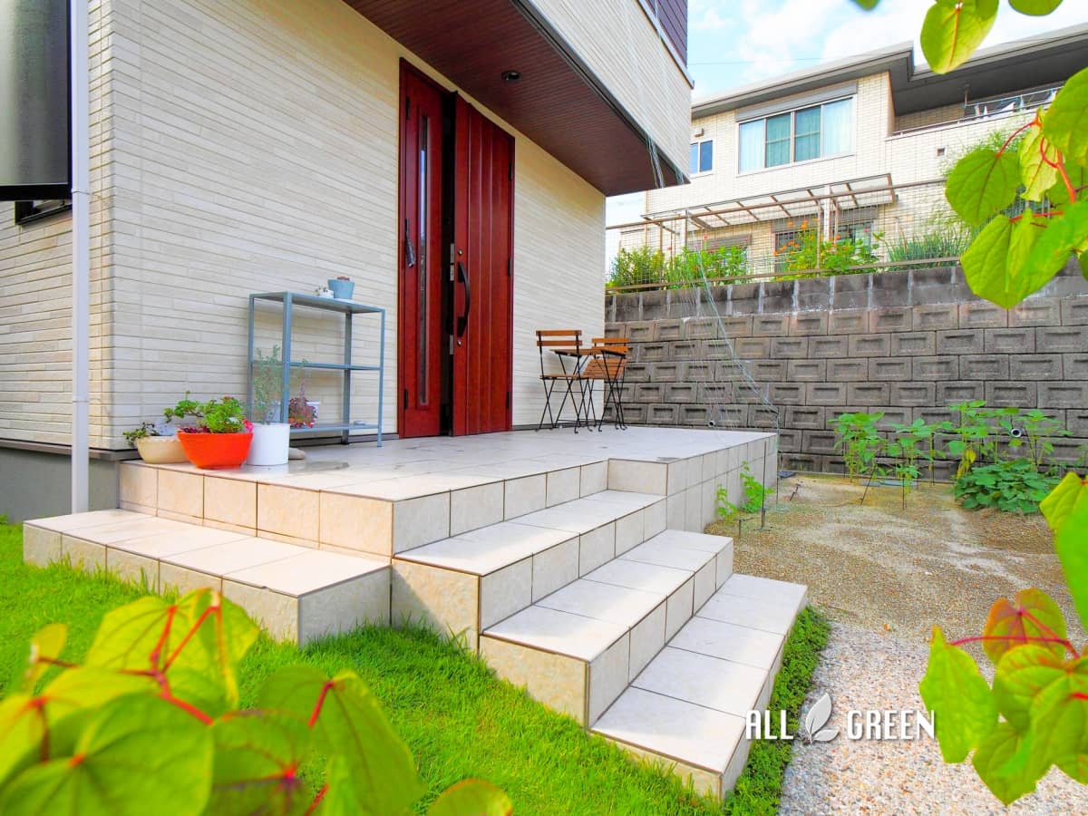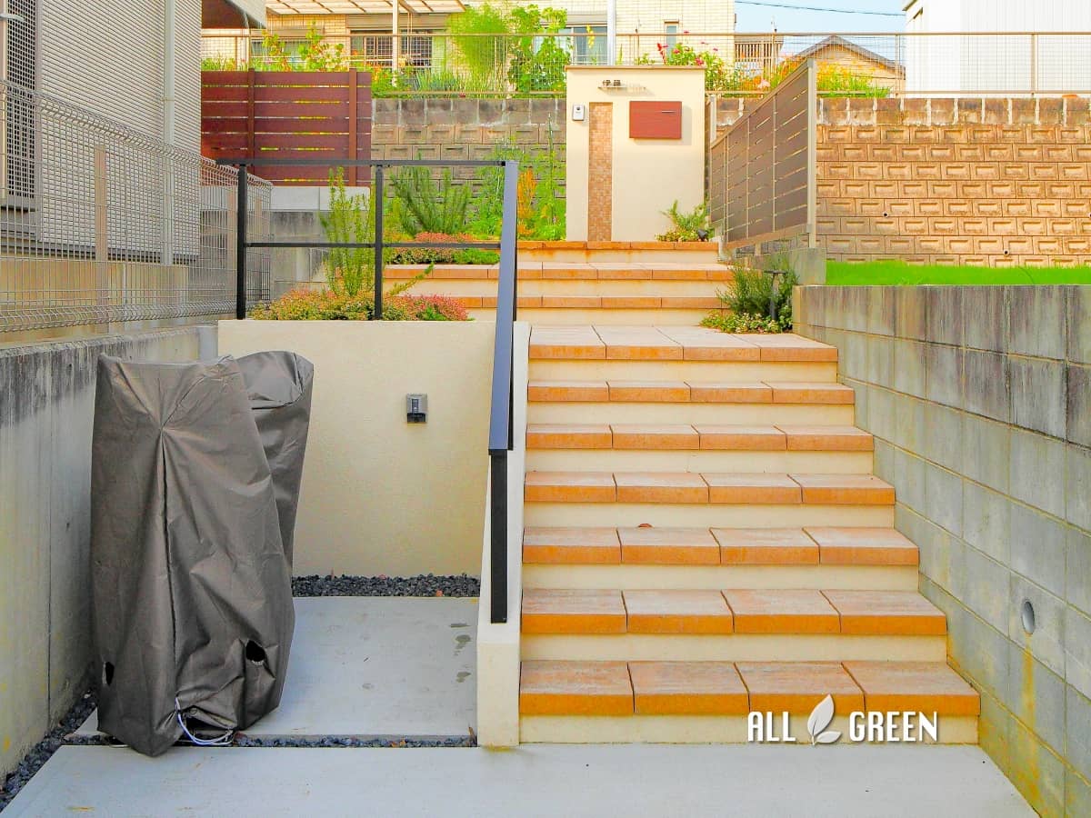 階段を上った先、一番最初に出迎えてくれる門塀はアクセントにオレンジ系のタイルを使用しています。