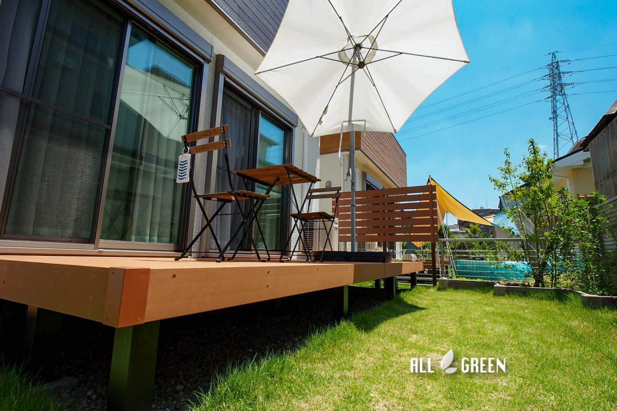 天然芝か人工芝か。メンテナンスの面で迷われていたお庭全体に敷かれた芝は ” 天然芝でもいけるかな‥? ”という一言で天然芝に。