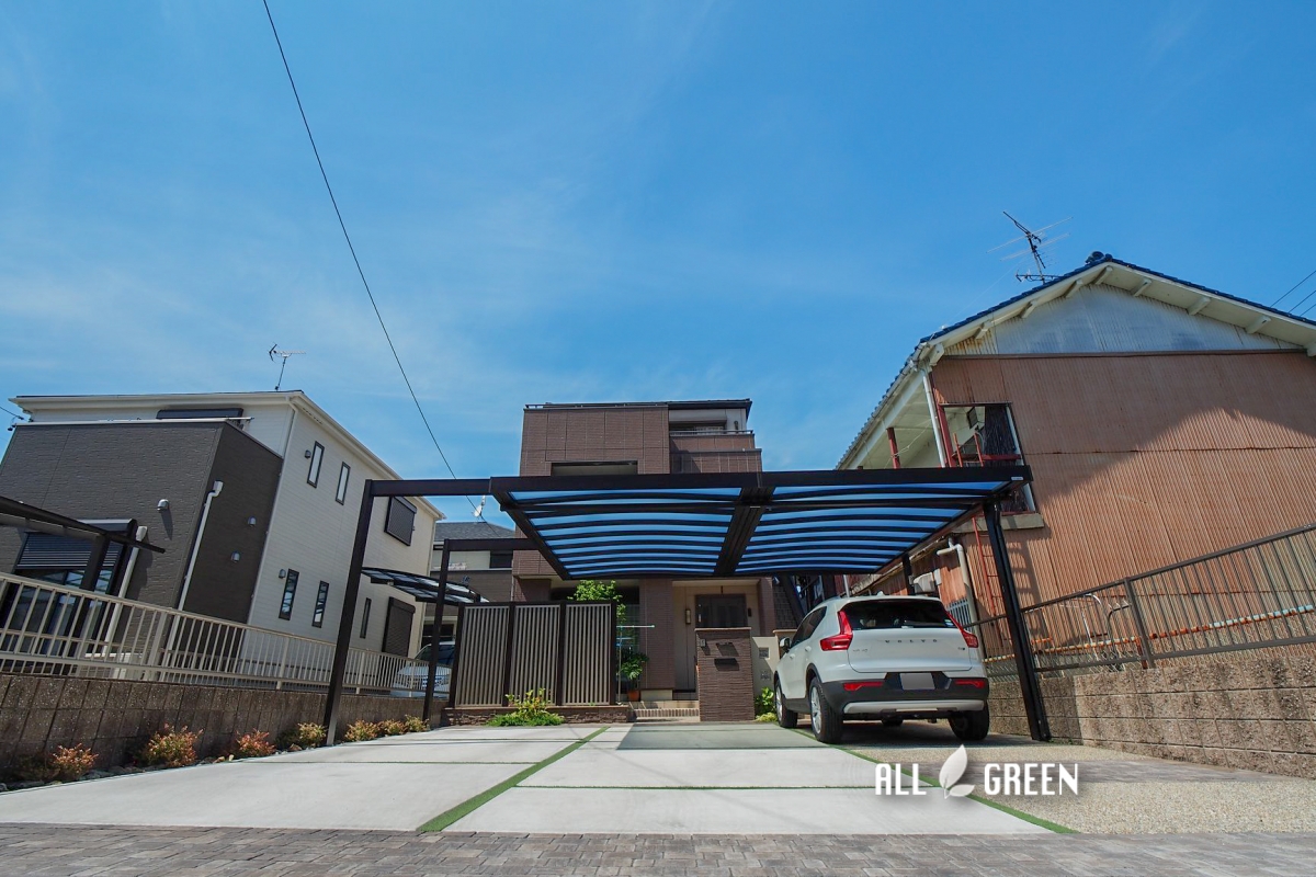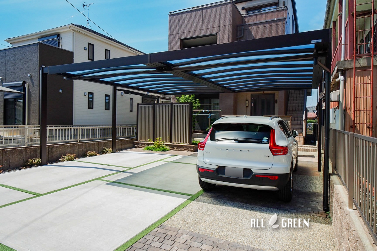 名古屋市中川区のリフォームでつくられたシンプルなフォルムでカッチリ決まったカーポートとグリーンの目地が優しい印象の駐車スペース