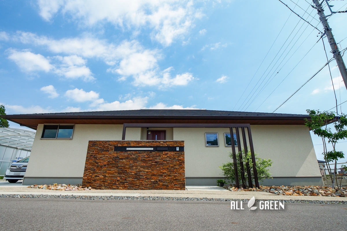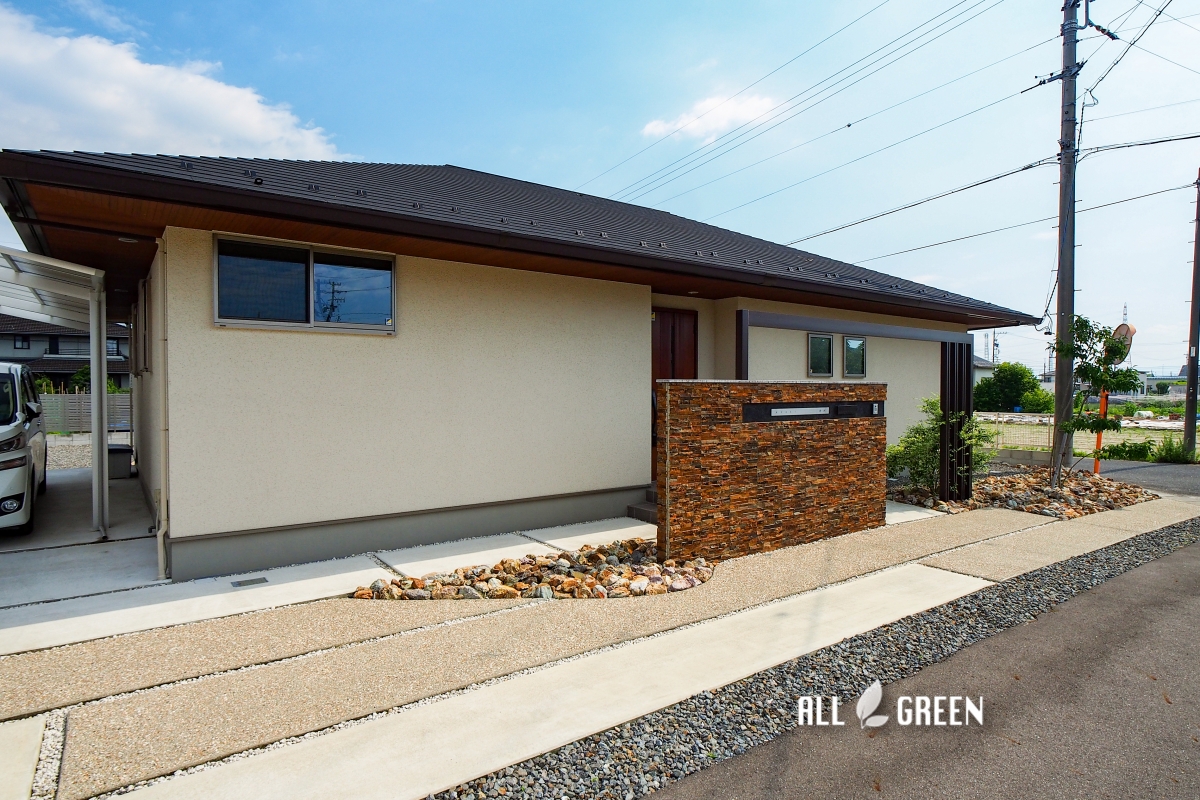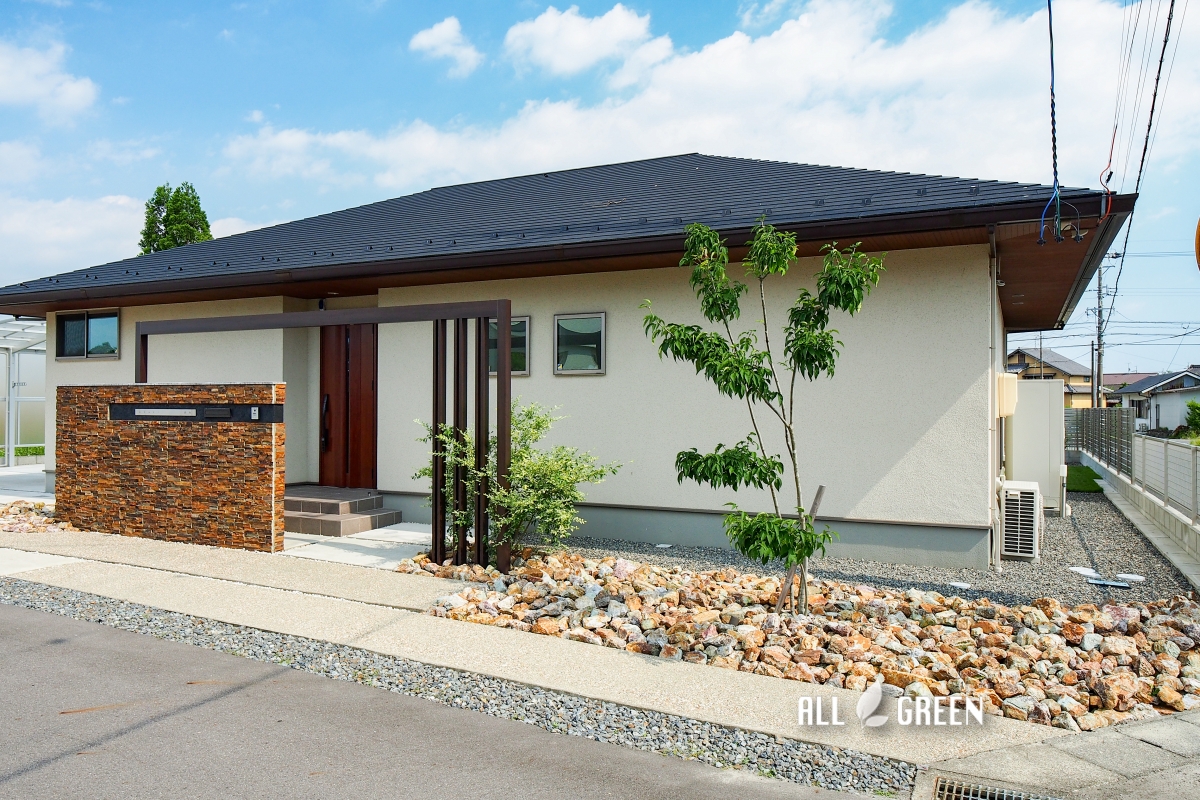 ダイナミックな門塀と寄り添うゲートフレーム、重厚な平屋にあう何年たっても飽きない外構。