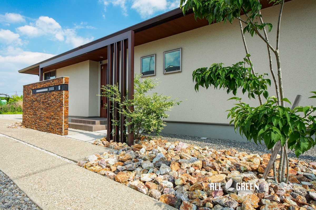 チャート石から顔を出す植栽とゲートフレーム。チャート石からはみ出るように施工された門塀とゲートフレーム。どこを切り取ってもナチュラルモダンな雰囲気に仕上がった外構は、いつの時代にも愛される温かみのある空間となりました。