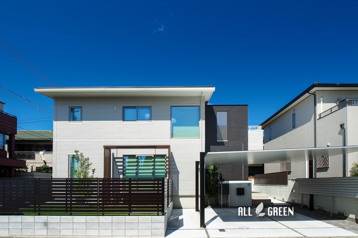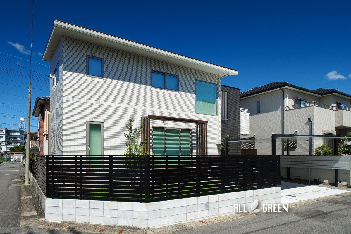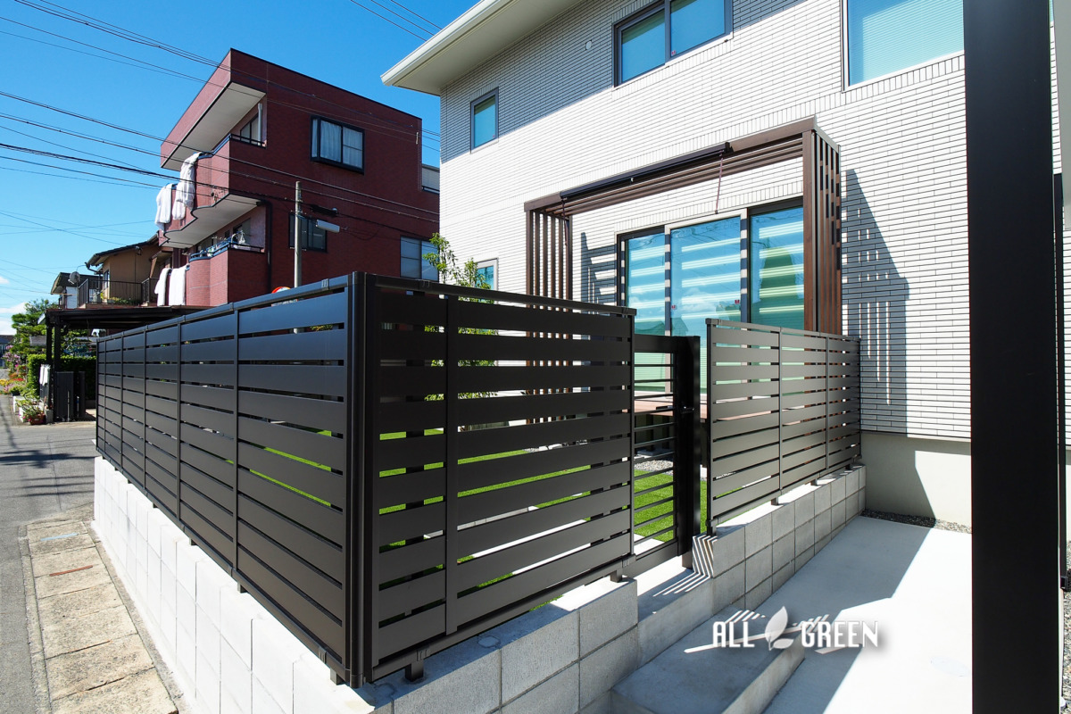 モダンを意識し選択したカームブラックの横太格子のフェンスは格子の間隔が狭めなので外部からの目隠しとしても役立ちます。