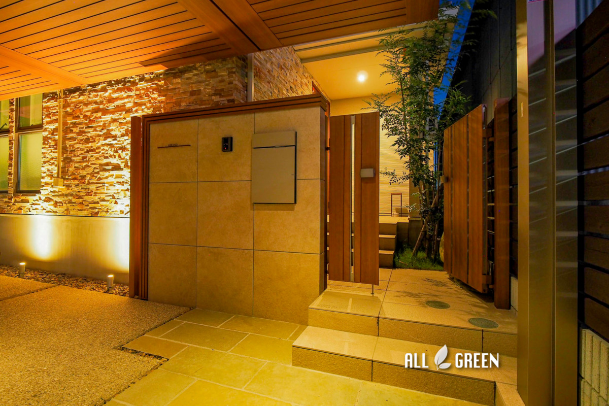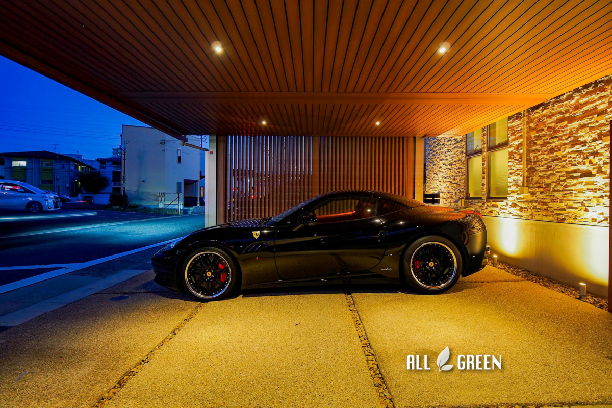 木調で温かみがありつつもライトアップで高級感をプラスした名古屋市天白区のカーポート