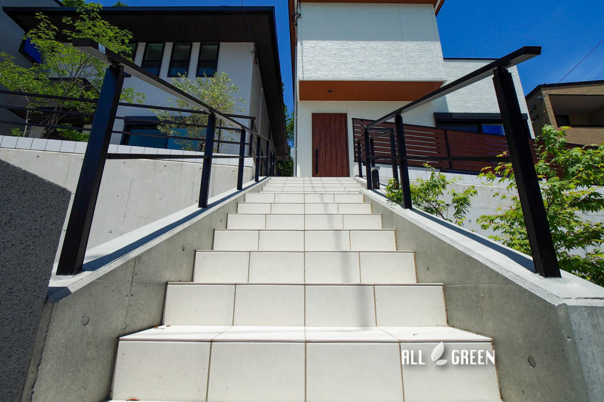 階段部分はINAXのフィネッツアというタイルを使用、雨でぬれていても滑りにくく、白タイルを使うことで清潔感も感じられますね。