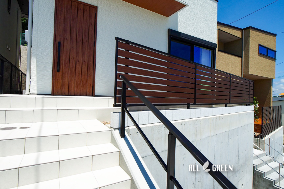 擁壁上に設置した転落防止のフェンスはYKKのルシアス。デザインが豊富でさまざまな住宅スタイルに合わせられるフェンスです。