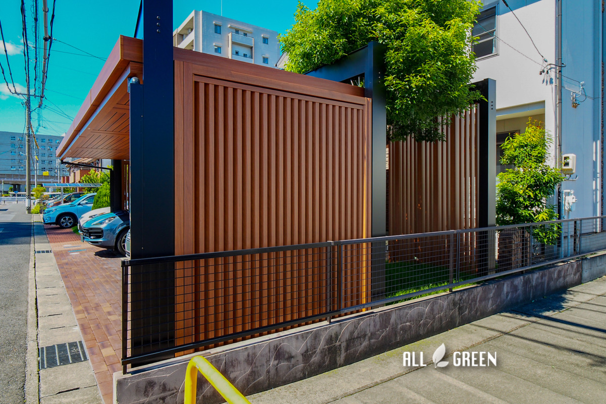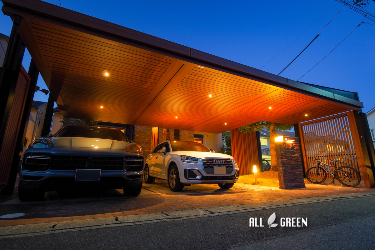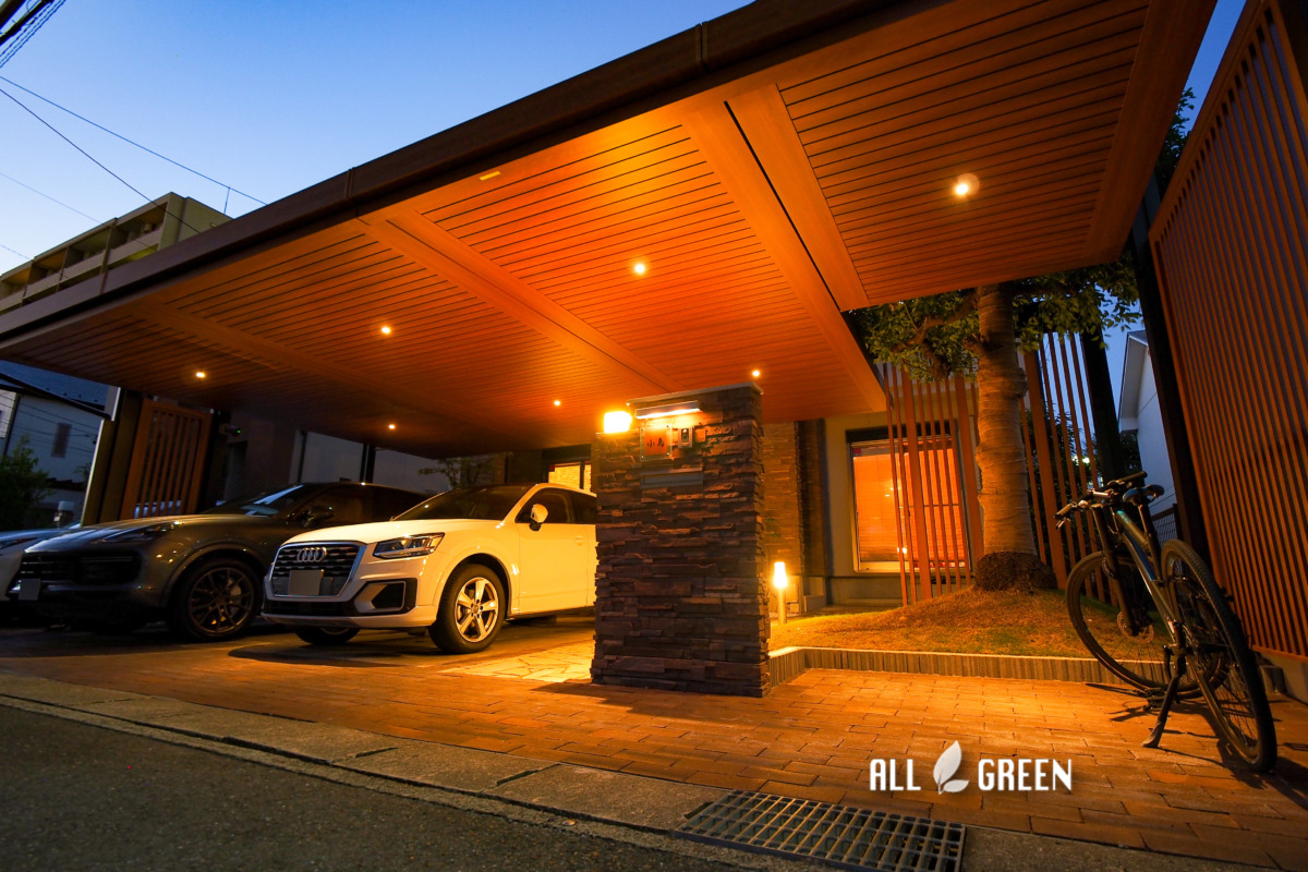 | エクステリア商品 | カーポート:三協アルミ Uスタイルアゼスト 柱/H26(黒) 200Ⅴコンセント設置 屋根/6027×2 6021×1 3018×1(ハフ/オレンジチェリー) 天井材にダウンライト7か所 トランスW35(グレイッシュベージュ) 後方梁の目隠し:Uスタイル用デザイン格子(オレンジチェリー) 35×115/14本 90×115/4本 前方梁の間の格子フェンス:三協アルミ Mグローリア H24(黒) 土間補修:TOYO プリウスブリック・サハラペイブ(サンドダーク) |