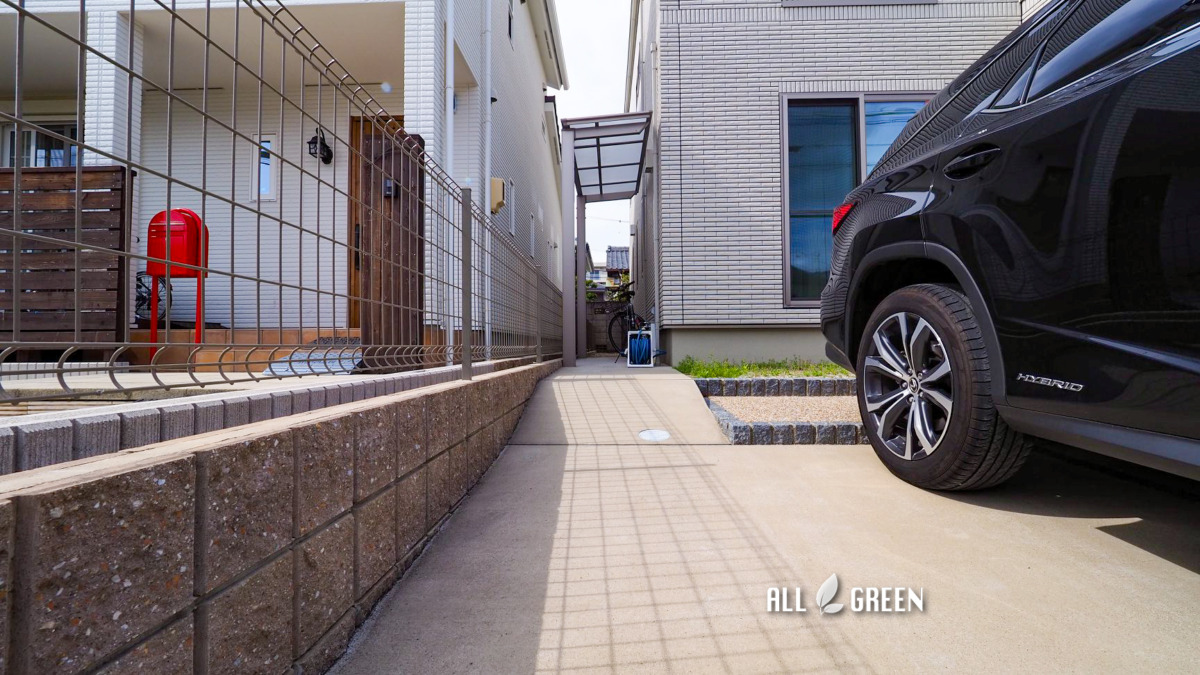 邸宅左側は土間コンクリートを刷毛引き仕上げに、右側のアプローチ部分は滑りにくく歩きやすい洗い出しコンクリート、見切りにはグレーのピンコロ石でアクセントをプラスしました。