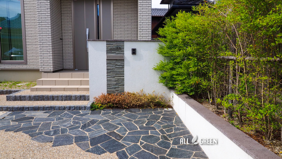 ふたつとして同じ柄の無い自然石は直線的なタイルと比べると天然の素材の良さが際立ち、コンクリートや砂利などとは違った仕上がりとなり高級感も感じられる門周りとなりました。