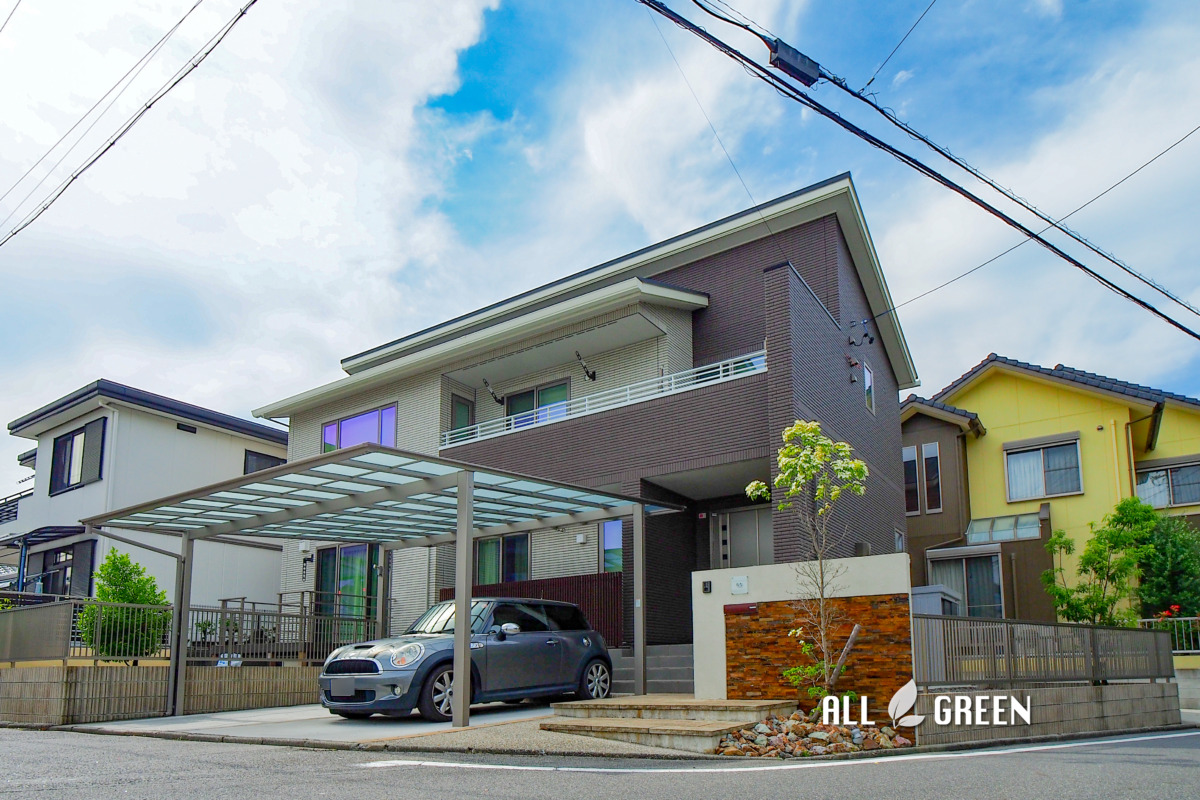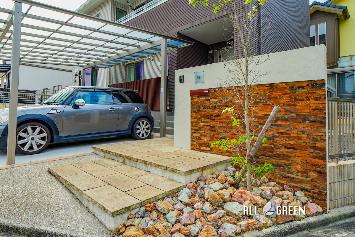 正面の駐車スペースには2台用のカーポート、ネスカFを設置し邸宅に馴染むカラーで合わせました。
