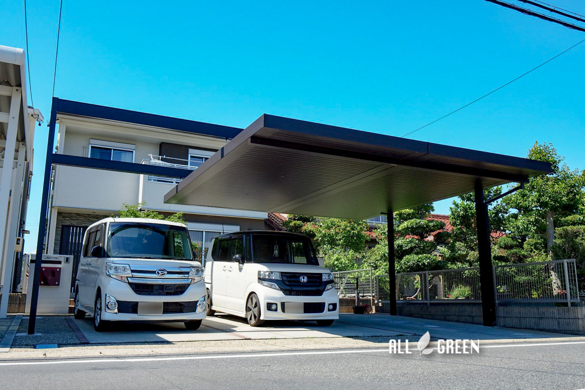 敷地幅いっぱいまで広げたフレームに2台分の屋根を配置。常時2台しか駐車しないとの事でしたので屋根のかかっていない部分はアプローチの動線とし、来客が来た際に駐車していただくスペースに。