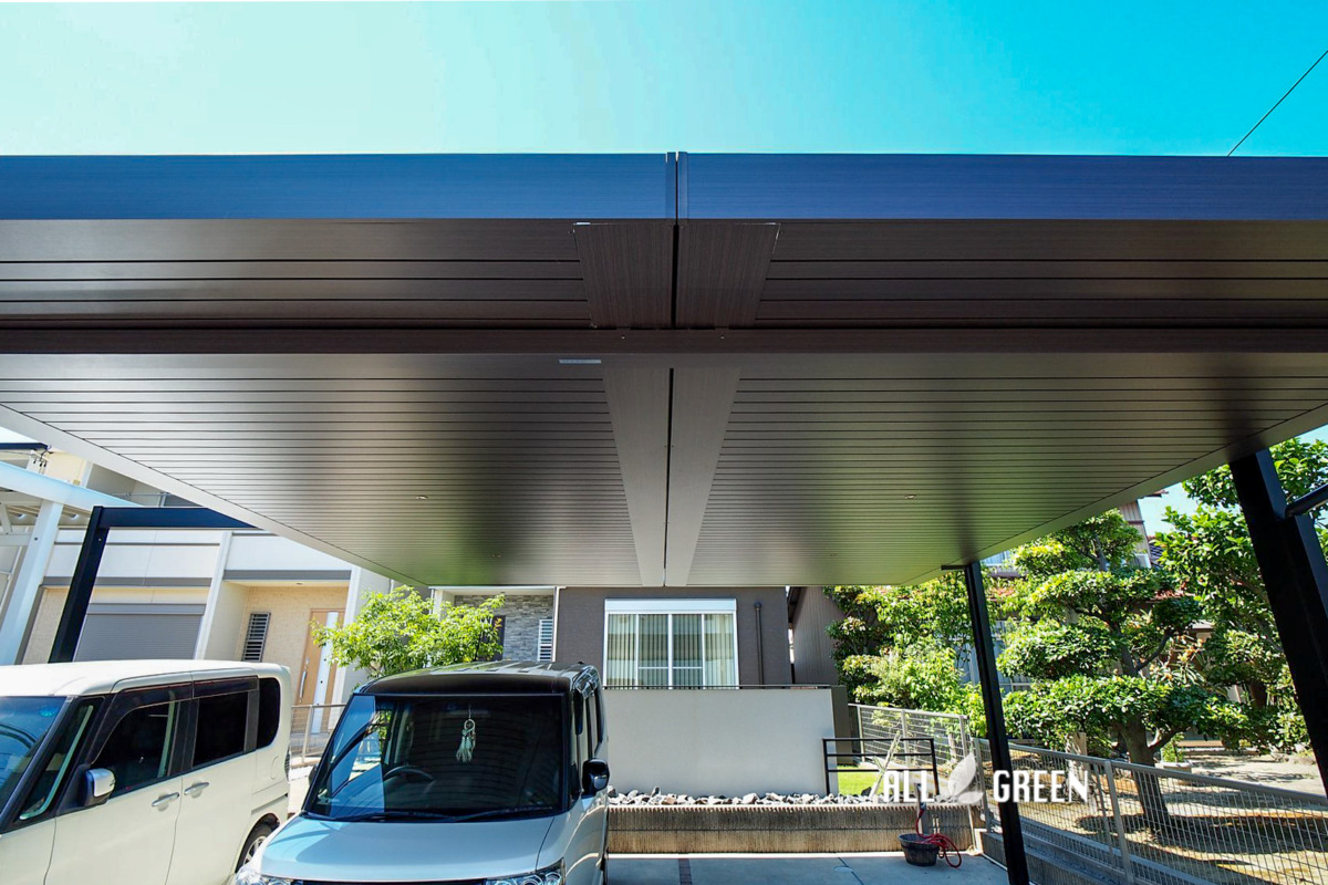 | エクステリア商品 | カーポート:三協アルミ/Uスタイルアゼスト H26 ディー60 W27✕2 梁・柱(ブラック)ハフ(ビターグレイン)天井材有(ビターグレイン)ダウンライト✕4か所 |
