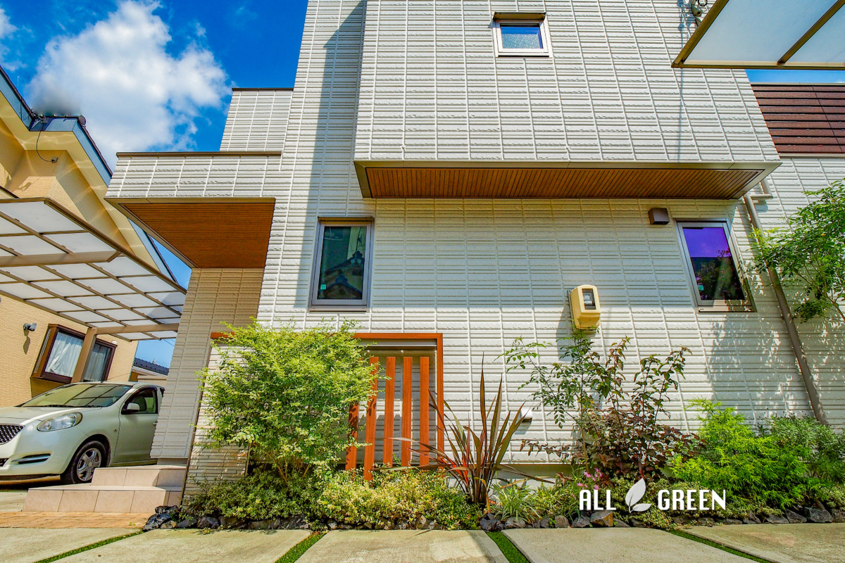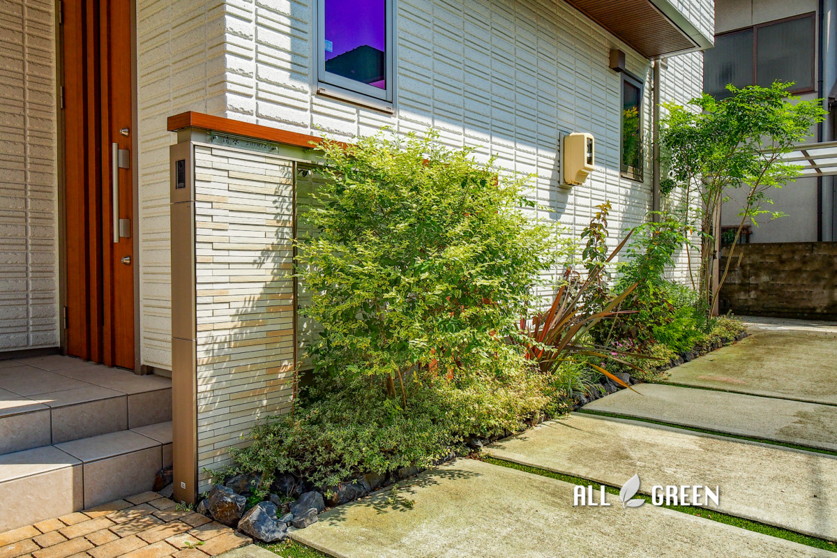 邸宅正面の外壁に沿う形で植栽を配置し、足元には下草でボリュームを出しつつ中木や低木などで動きを出すことで存在感が際立っています。