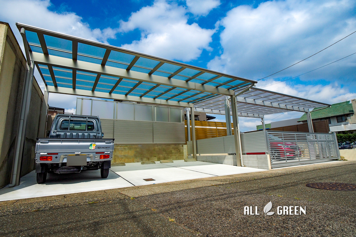 車3台分を覆う大きなカーポートはYKKのエフルージュトリプルFIRST。