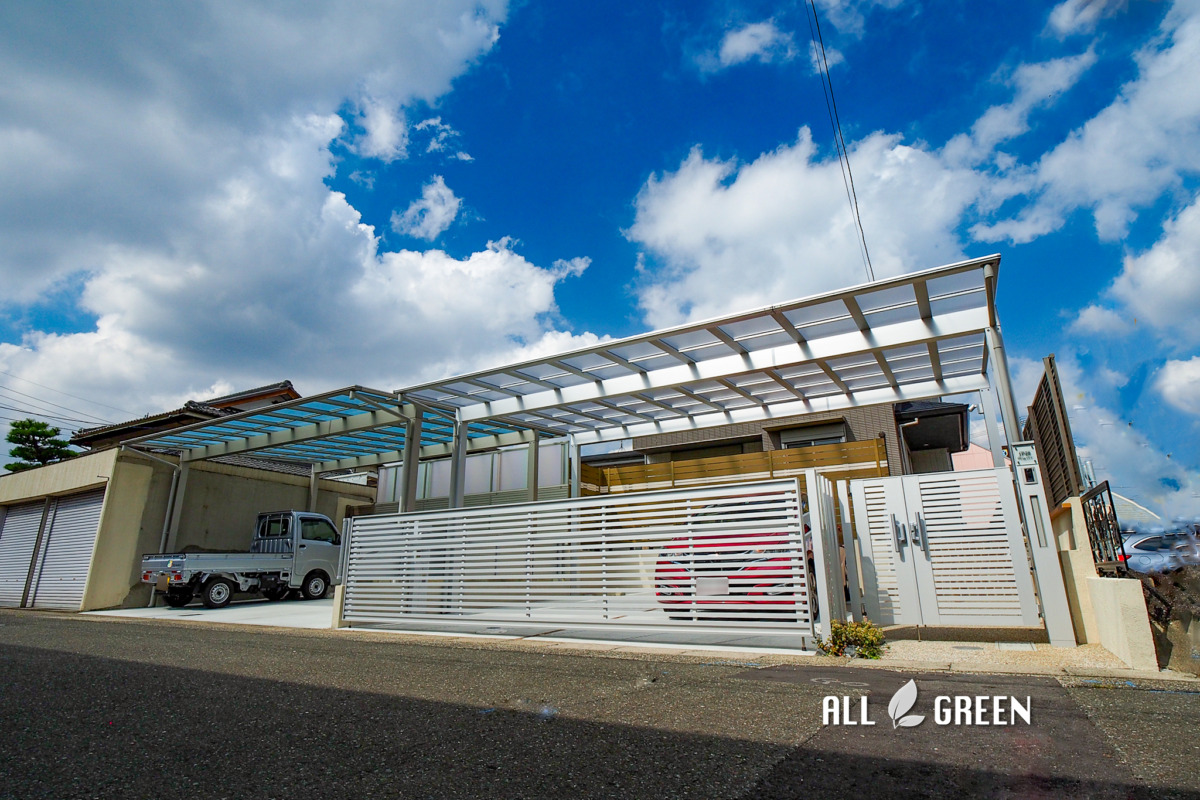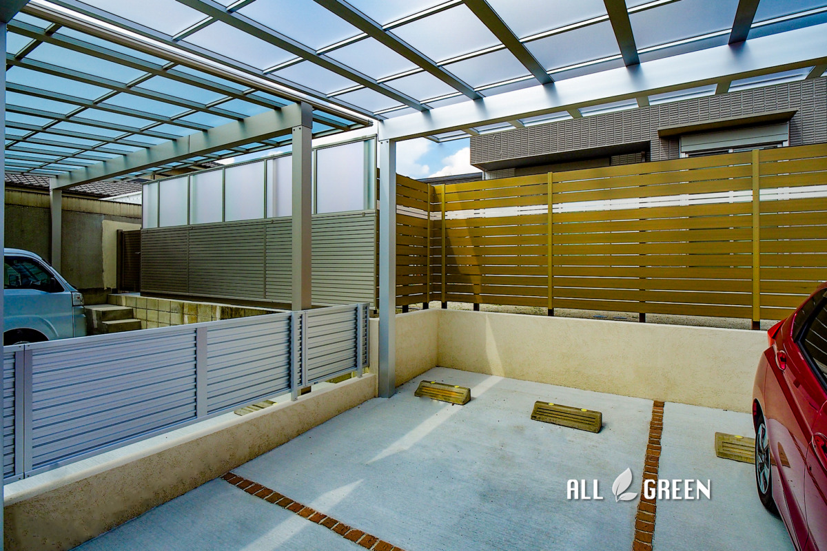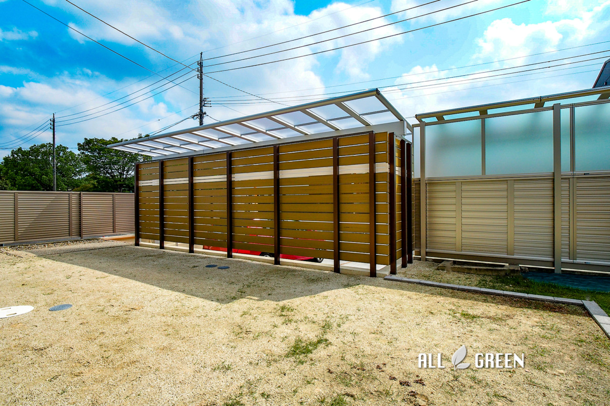 カーポート後ろに設置したフェンスはB-Life.sのBウッドスタイル。