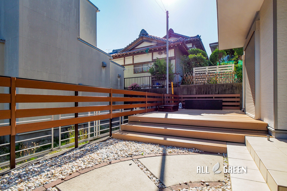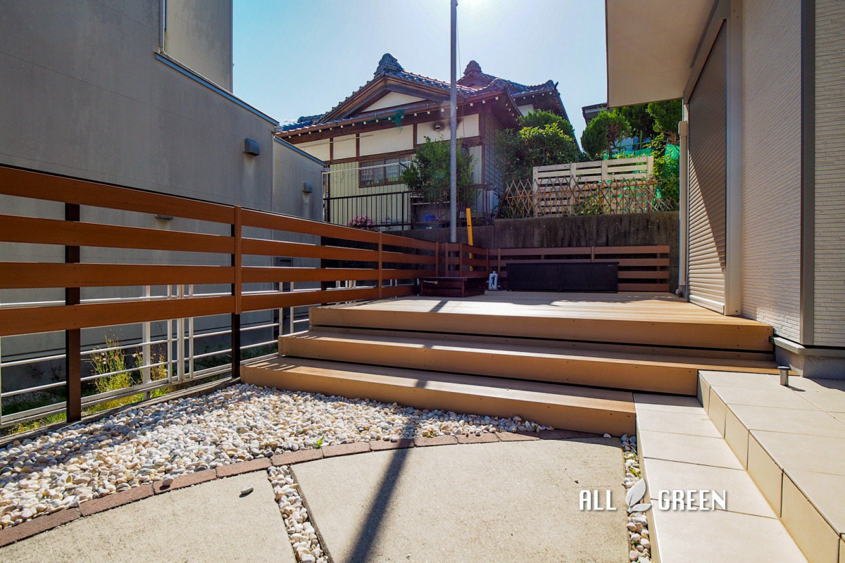 | エクステリア商品 | ウッドデッキ:LIXIL/樹ら楽ステージ木彫(クリエラスクR) 多段幕板+ローデッキ2段 下:川砂利+防草シート フェンス:B-Life.s/Bウッドスタイルベーシック(チークブラウン) 板幅120板4枚  |