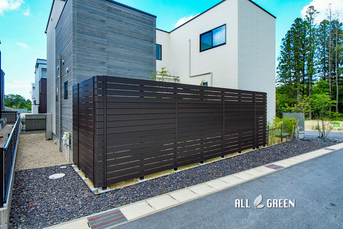 邸宅横に施工されたブラウンの目隠しフェンスの奥には素敵な憩いの空間が…。