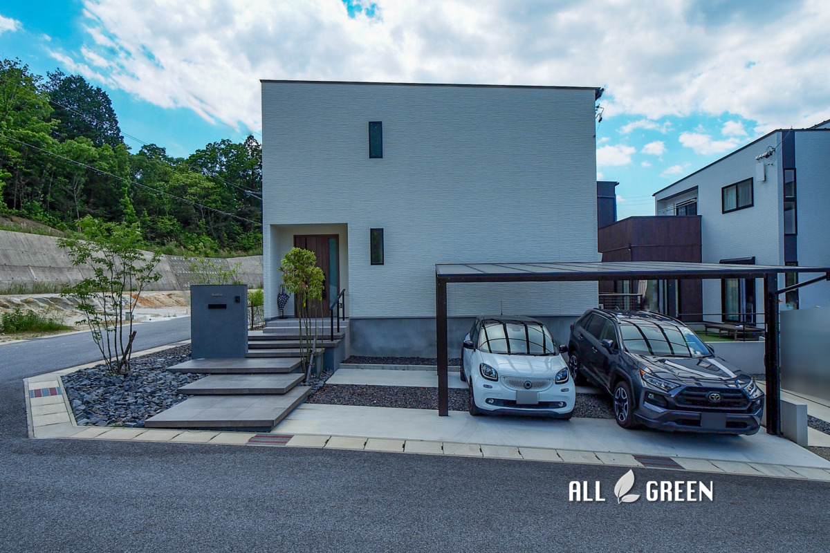 土間コンクリートや砕石とのコントラストがモダンさをアップ。