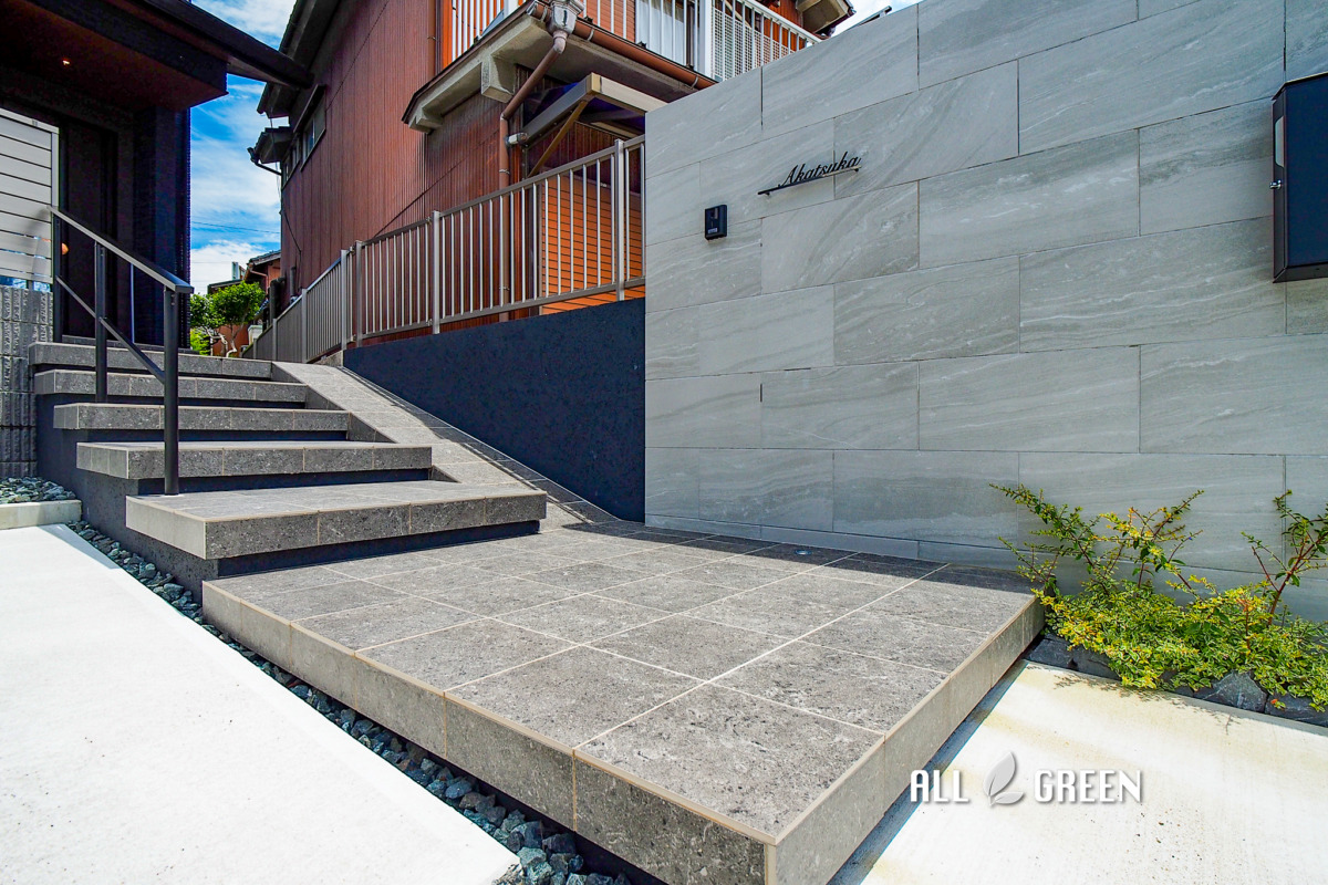 駐車場と建物に高低差があるこちらの邸宅はアプローチ階段を6段設け、歩きやすいように段差をなるべく低くし踏み面を広く設定しています。また階段横にスロープも取り入れ機能面も充実しました。