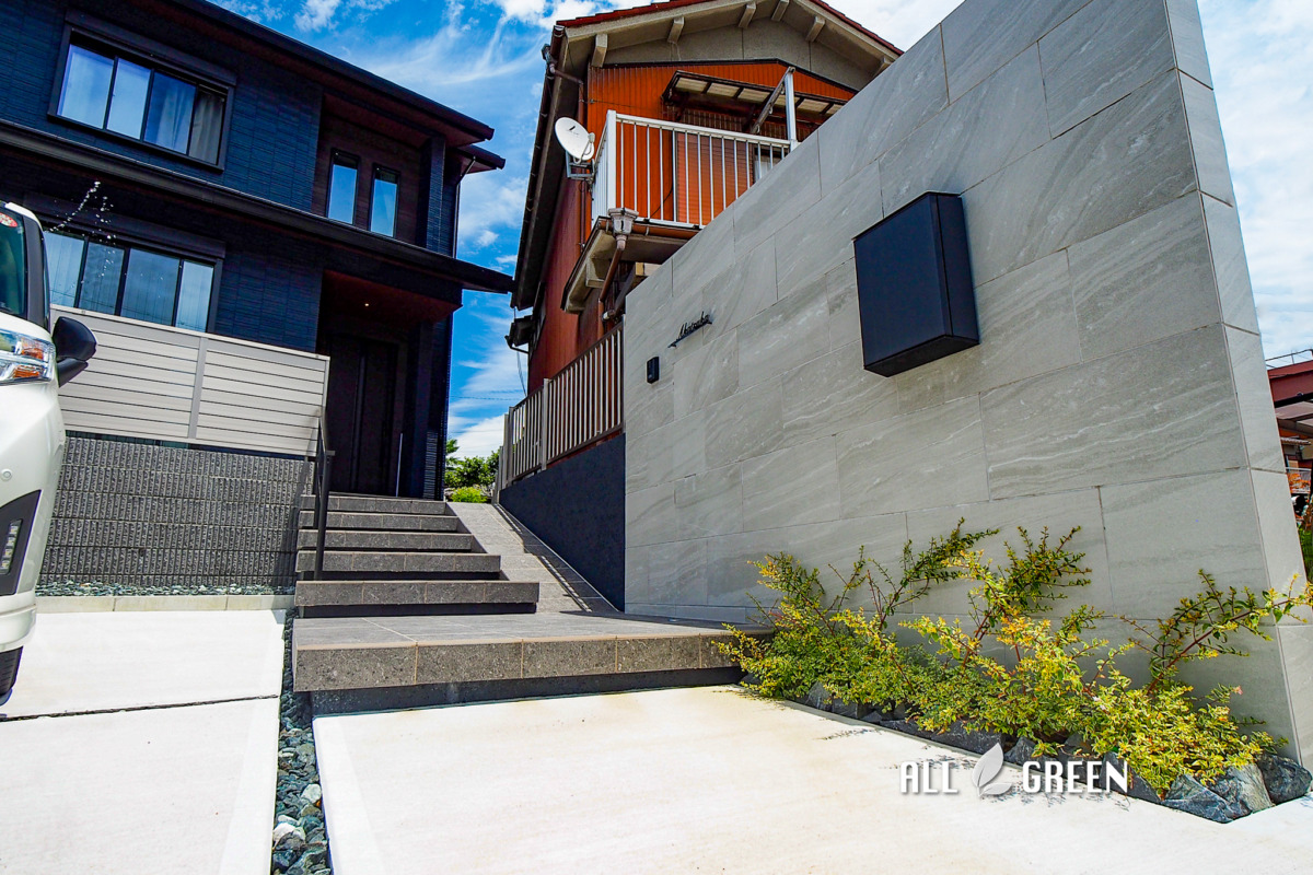 名古屋市緑区の新築外構は高低差を活かし緩やかな階段とスロープで充実したファサードへ