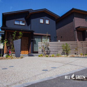 タイルや単粒砕石、割栗石をブラックカラーにすることで全体を引き締め、かつモダンさを上げています。
