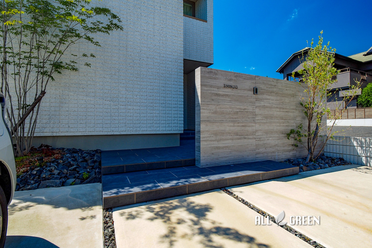 素材を変えて施工した2枚の塀は玄関周りの視線をしっかりとブロック。
