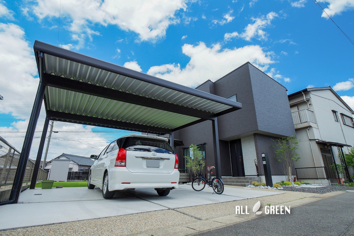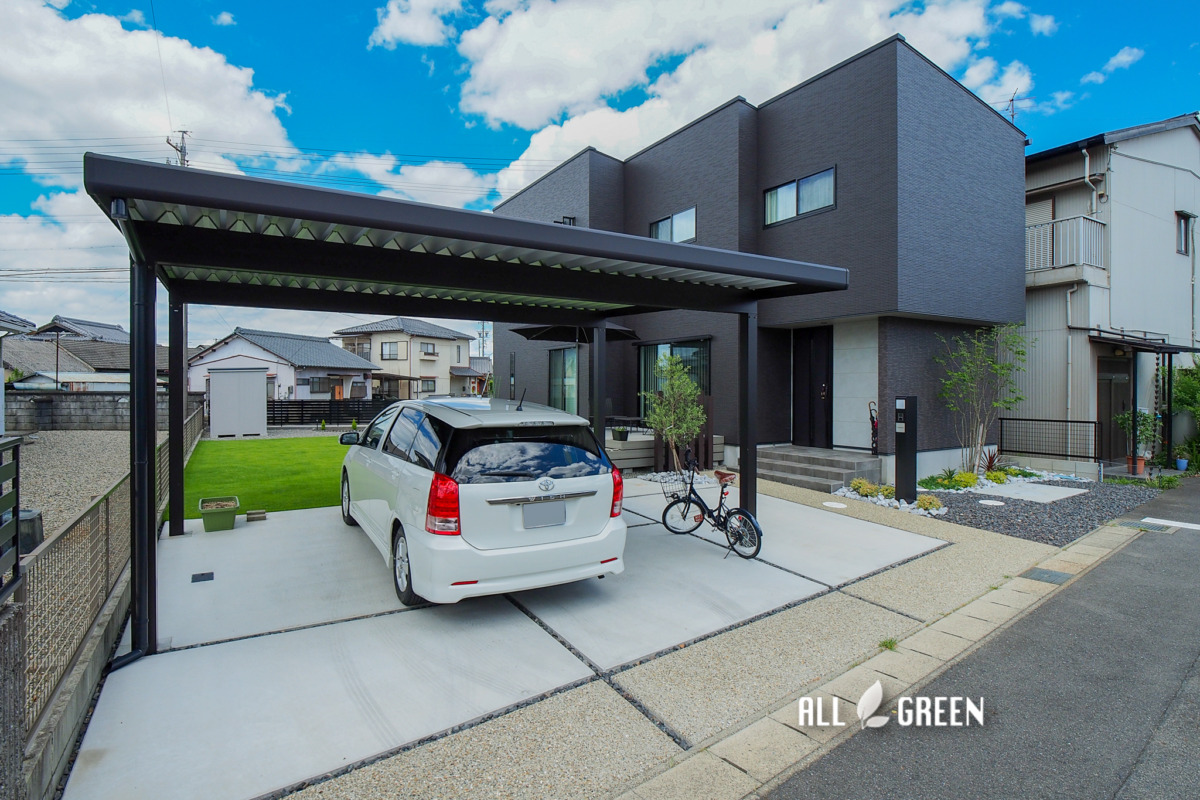 向かって左側の駐車スペースは土間コンクリートを打設し、スリット目地を入れました。目地はピンコロ石や植栽目地、インターロッキングブロックなど様々な選択肢がありますが今回は粒砕石を敷き、モノトーンで仕上げ、マットブラックのカーポートが映えるデザインに。