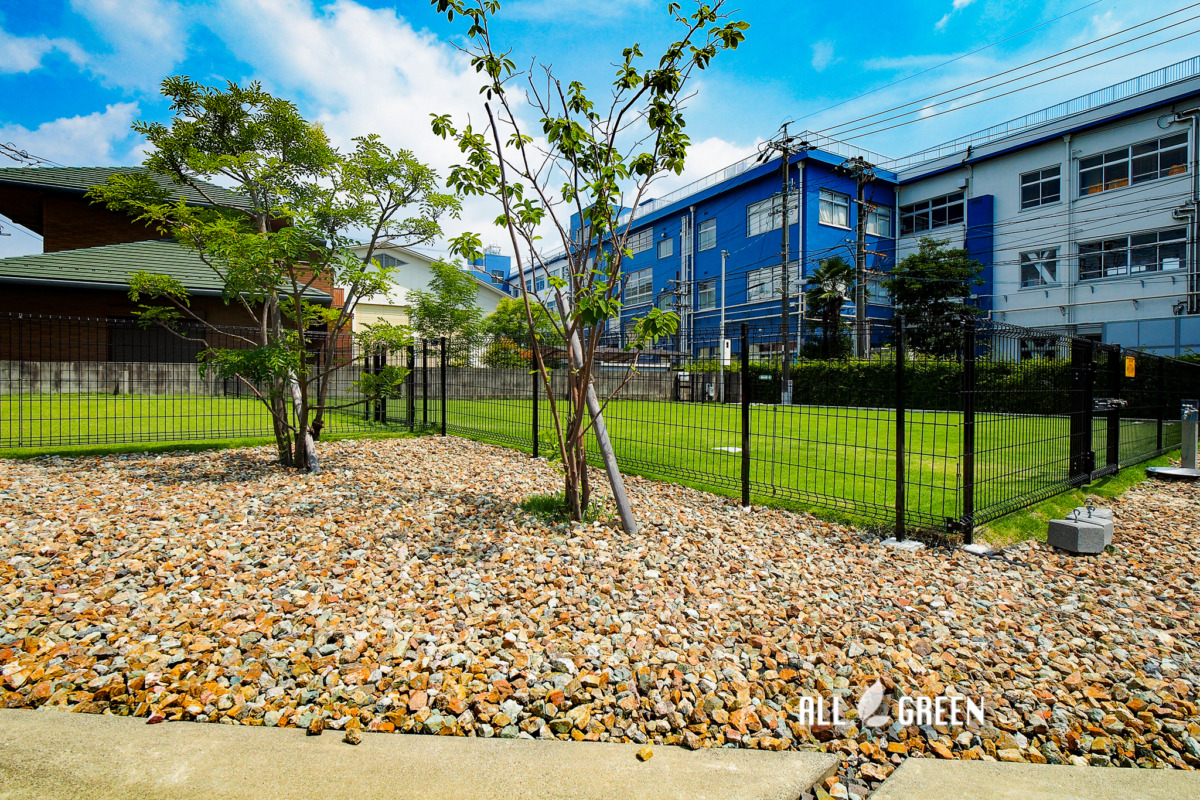 | エクステリア商品 | フェンス:LIXIL ハイグリッド N8型T-10(ブラック) 門扉:LIXIL ハイグリッド門扉 N8型08-10(ブラック) 芝生:天然芝 TM9 砕石敷:チャート石 |