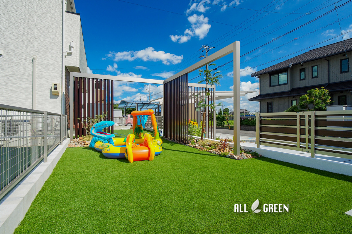 写真では大きなプールが置かれていますね。人工芝は水はけがよく、天然芝と違い水が流れてもぬかるむ恐れもないのでプールを広げるスペースに最適です。