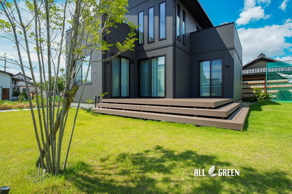 お庭には大きくて立派なウッドデッキと一面に広がる広大な天然芝の姿。