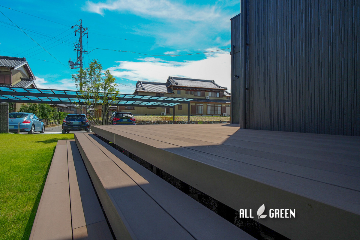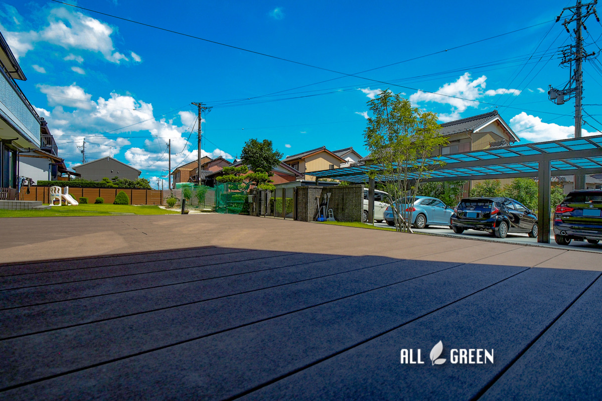 | 外構工事概要 | 稲沢市O様邸新築外構 駐車場、カーポート、アプローチ、ウッドデッキ、ガレージ、境界フェンス、照明、植栽、天然芝 |