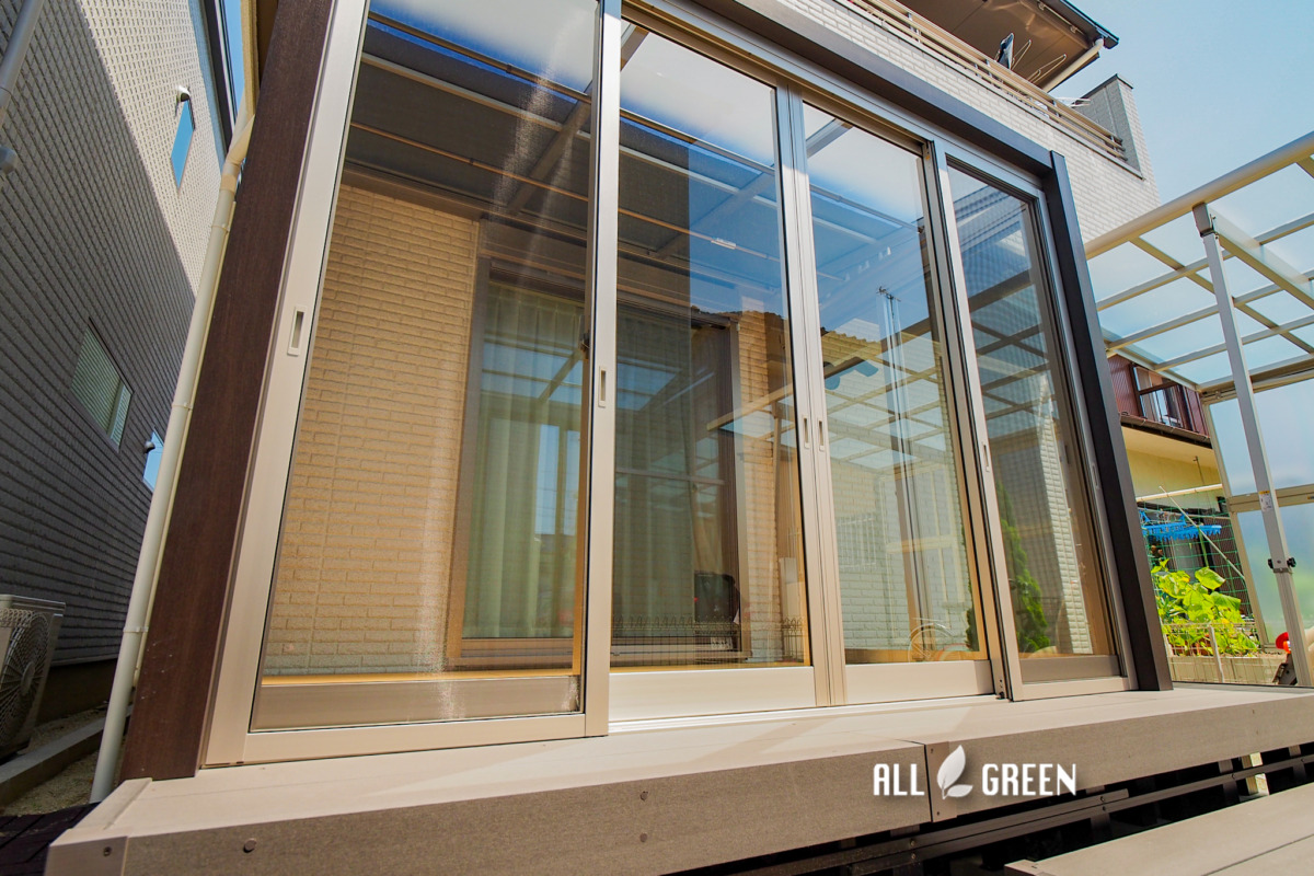 当初違う商品を設置したいというお話でしたが、お打合せを重ねていく中でガーデンルーム内のデッキ天端と邸宅の掃き出し窓サッシをできるだけ近づけたいというご要望があったため、そのイメージに一番近しいソラリアをご提案。