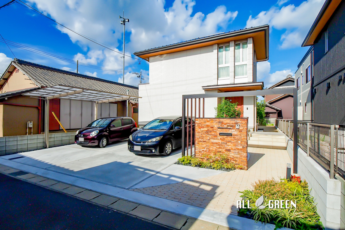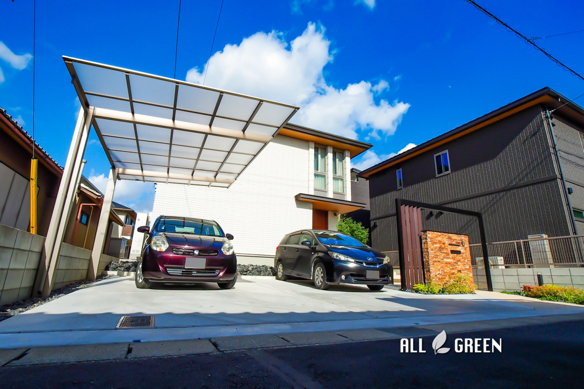 | 外構工事概要 | 北名古屋市K様邸新築外構 駐車場、カーポート、ゲート、アプローチ、門柱、フェンス、デッキ、照明 |